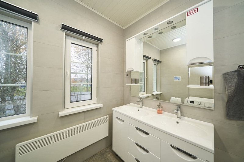 Коттедж со всеми удобствами и отоплением: кухня, 4 спальни (в 2-х спальнях большие двухспальные кровати, в 2-х — по 2 односпальные) + гостиная с диваном-кроватью, 3 туалета, 2 душа, сауна, камин, терраса, полностью оборудованная кухня (холодильник, плита, духовка, чайник, кофеварка, тостер, микроволновая печь, посудомоечная машина, все кухонные принадлежности), стиральная машина, телевизор с плоским экраном, обеденная зона на улице, постельное белье, полотенца, тапочки, утюг, фен, сушилка для белья, все необходимые принадлежности для барбекю.