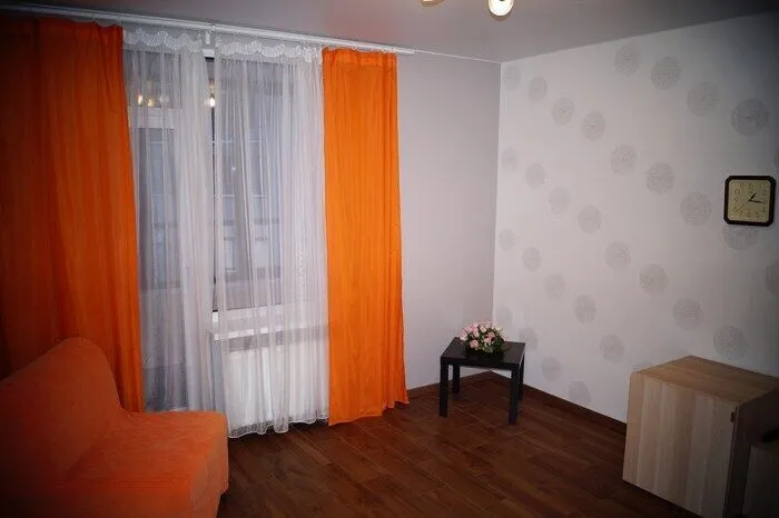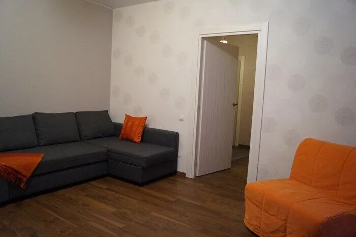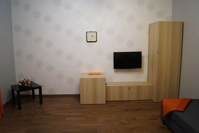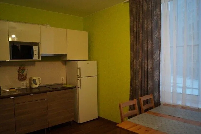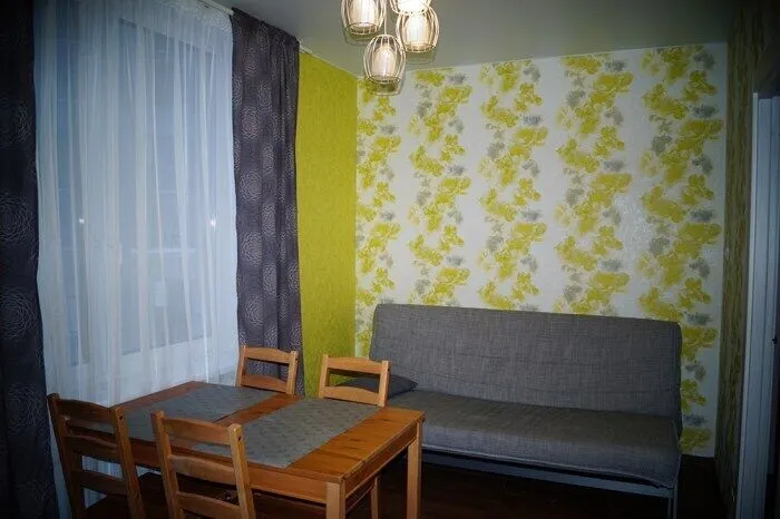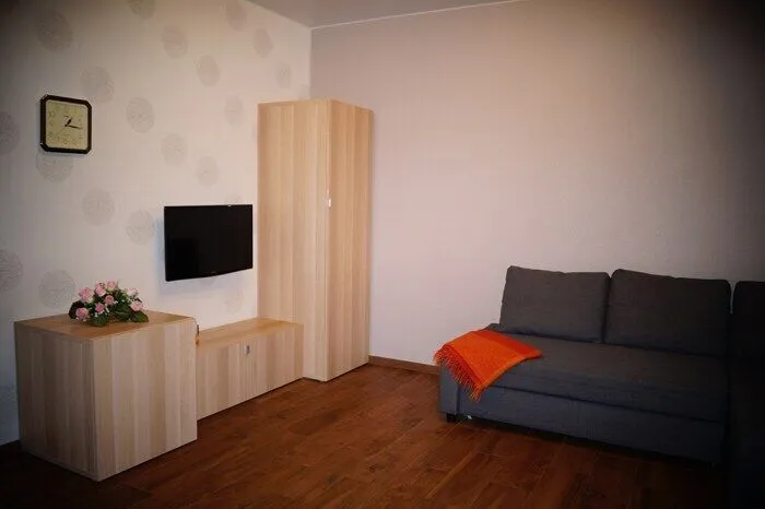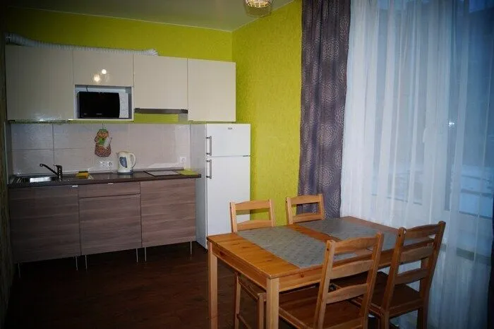 В квартире есть комната с угловым, комфортным для ежедневного сна и отдыха диваном, корпусной мебелью и ЖК- телевизором, а также большая кухня-гостиная в которой располагается столовый гарнитур на 4 персоны, кухонная мебель и удобный двуспальный диван-кровать.