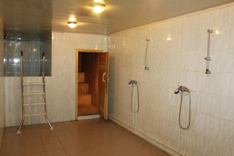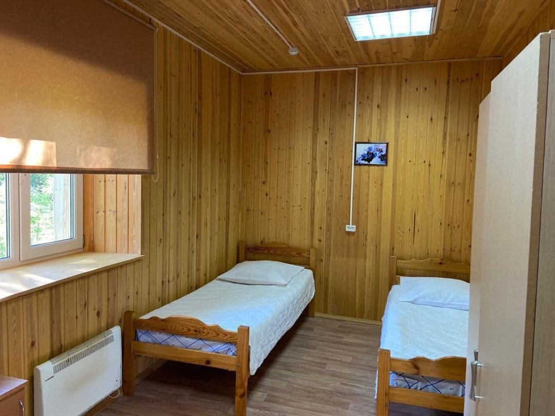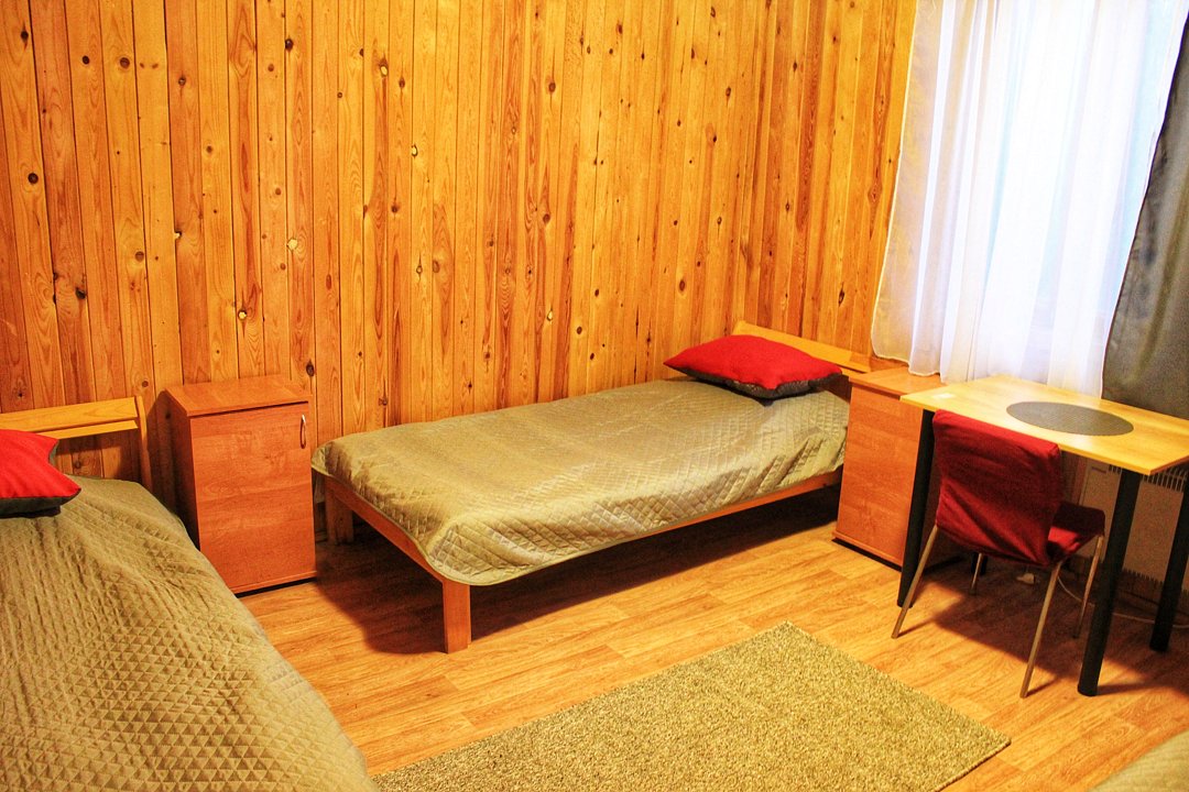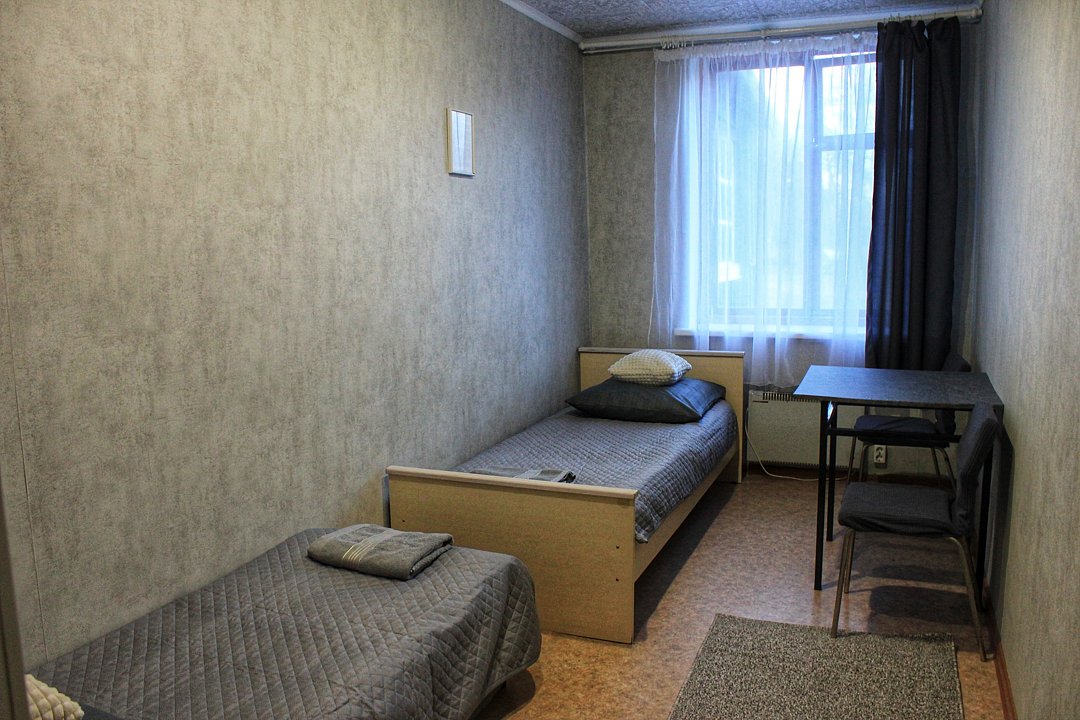 В номере: две одноместные кровати, стол, стулья, тумбочки, вешалка. Кухня, туалеты и душевые общие на этаже.
