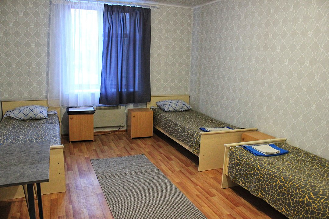 В номере: три одноместные кровати, стол, стулья, тумбочки, вешалка. Кухня, туалеты и душевые общие на этаже.