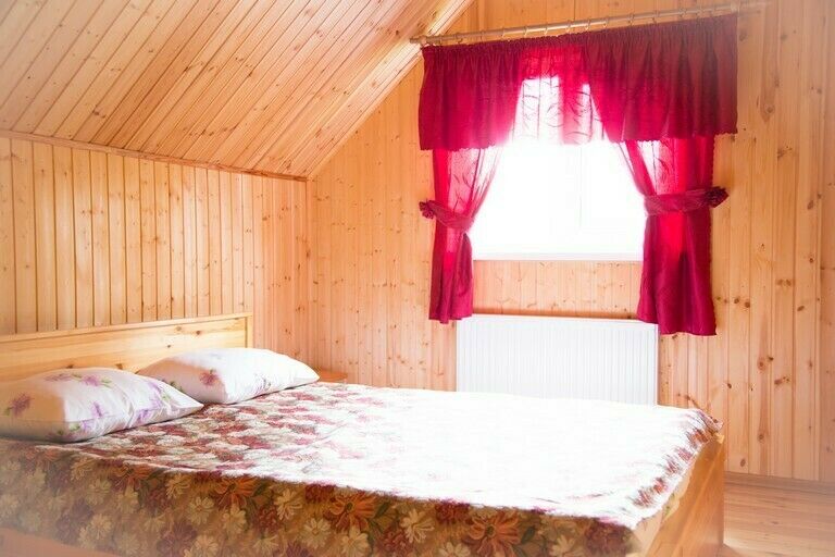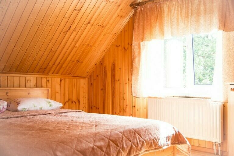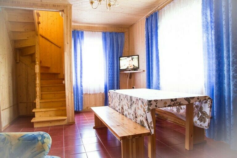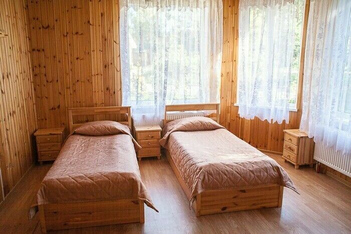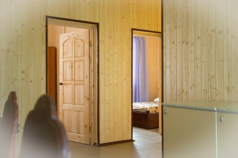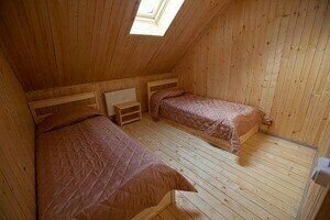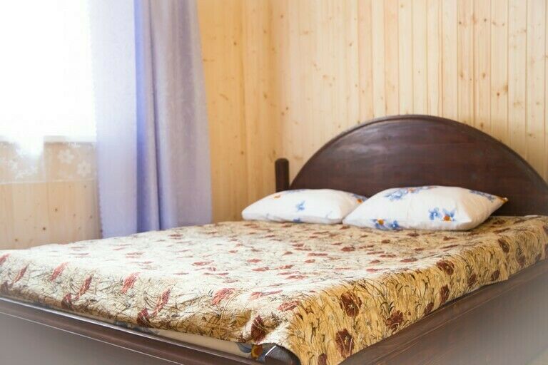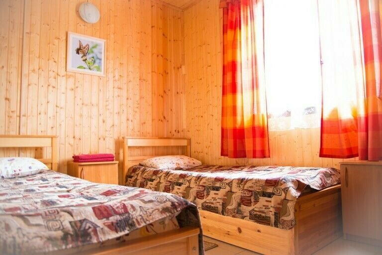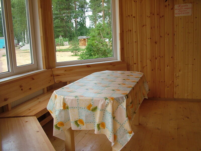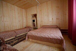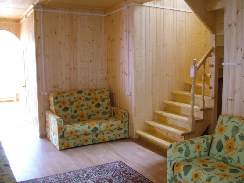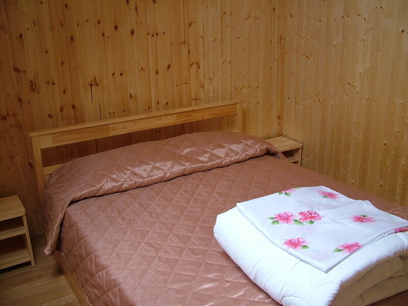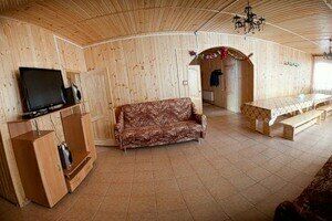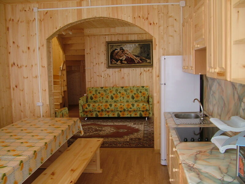 Небольшой коттедж расположен на территории базы отдыха. В коттедже есть две спальные комнаты с двуспальными кроватями. Холл идет вместе с гостиной, где могут расположиться еще два человека на диване. Ещё есть кухня, сан-узел, а так же сауна и душевая кабинка.