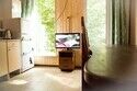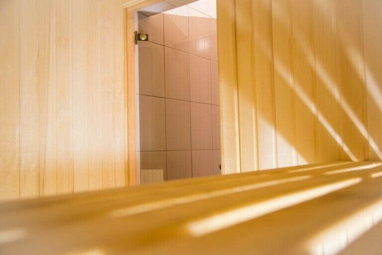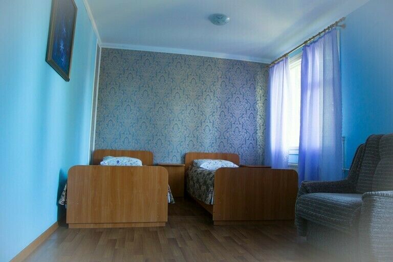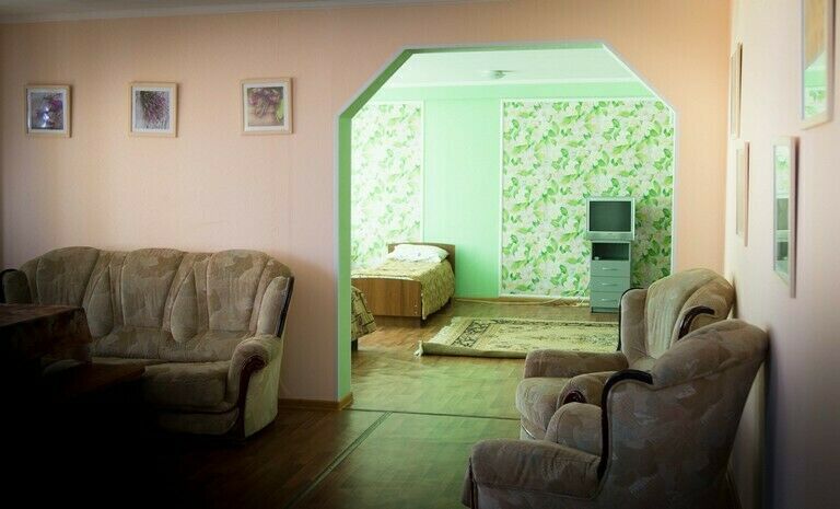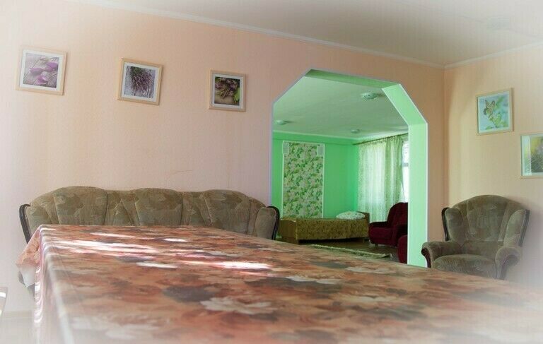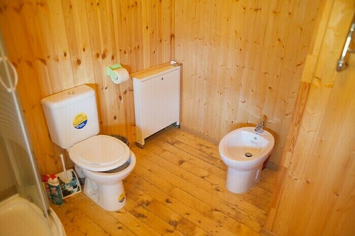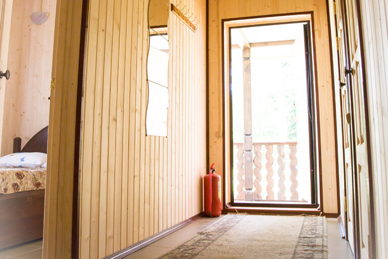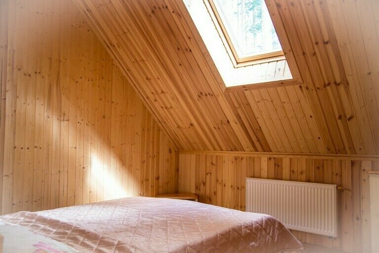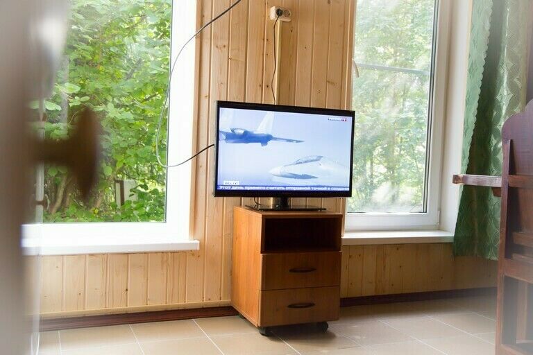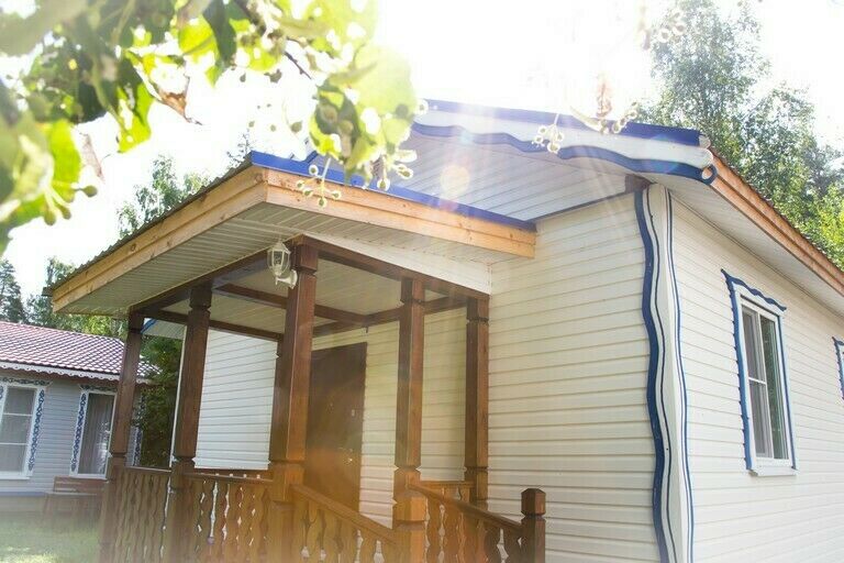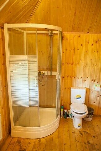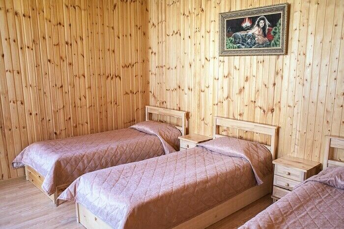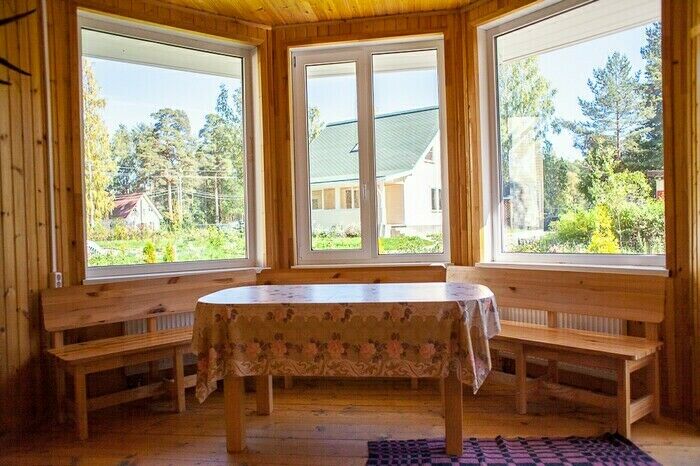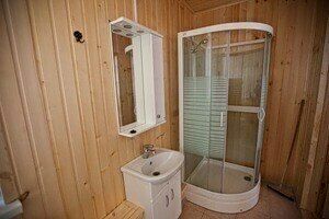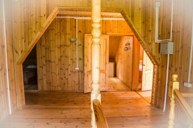 Небольшой коттедж расположен на территории базы отдыха. В коттедже есть две спальные комнаты с двуспальными кроватями. Холл идет вместе с гостиной, где могут расположиться еще два человека на диване. Ещё есть кухня, сан-узел, а так же сауна и душевая кабинка.