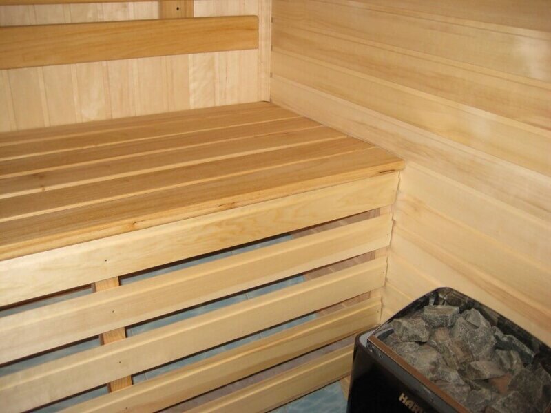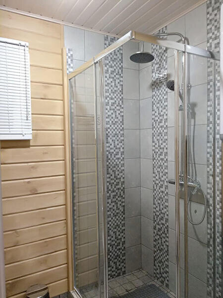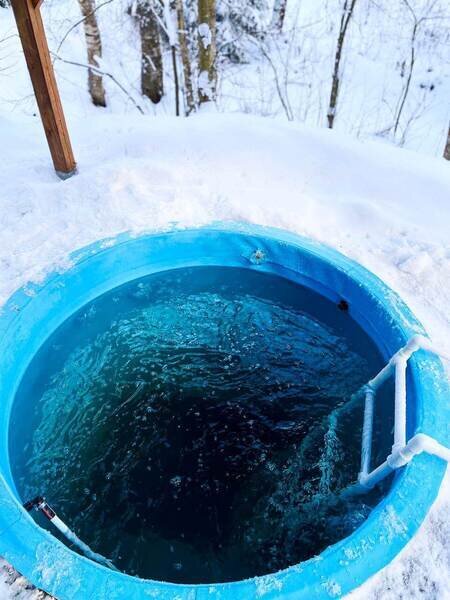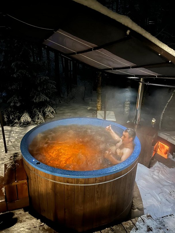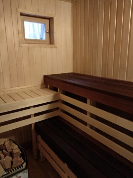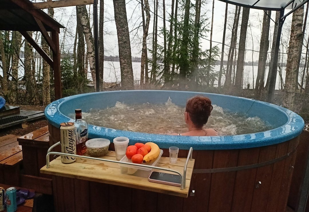 В бане комфортно могут находиться 5-6 человек. С уличной веранды можно окунуться в купель с холодной озерной водой, расположенной тут же у входа на веранду или пробежаться по тропинке 20 метров и нырнуть в озеро.