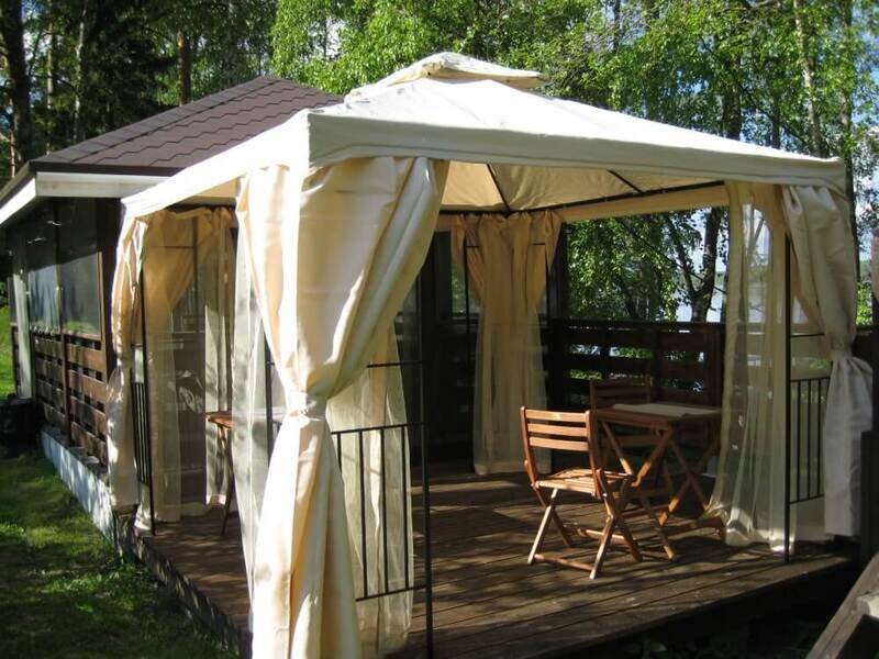 Беседка до 16 человек: На самом берегу, с видом на озеро, удачно вписана в окружающий ландшафт. В беседке сделано утепление, стеклопакеты, мебель для приготовления блюд, немецкая дровяная печь-духовка, два больших стола с лавками и стульями.