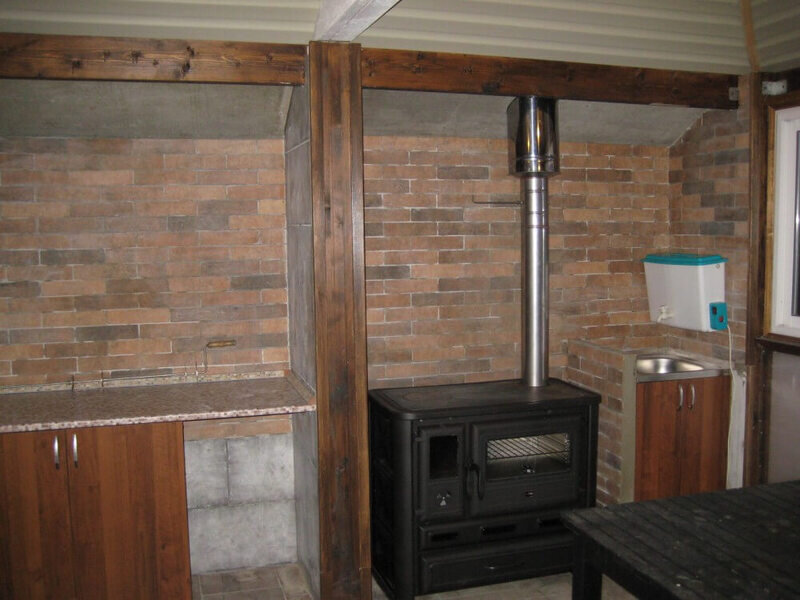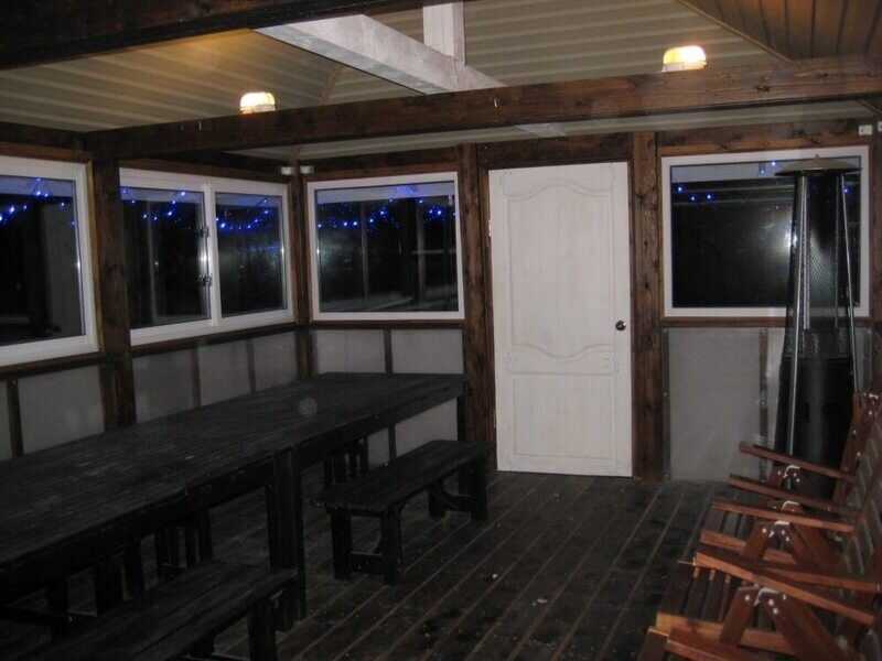 Дополнительно установлен газовый обогреватель. Можно комфортно находиться даже при небольшом минусе. Также рядом большой мангал с вертелом и казаном. Сдается как проживающим в коттеджах, так и отдельным компаниям.