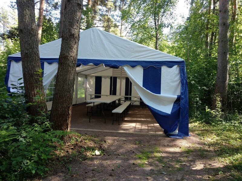 Шатер для большого праздника: В окружении сосен, уединенно расположен большой шатер 6*8 метров. В нем могут разместиться за столами до 30 человек. Возможность подключить аудио и видео аппаратуру.