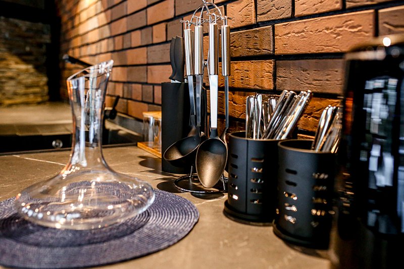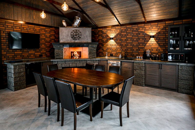 Общая площадь дома 175 кв. м., а также 60 кв. м. эксплуатируемой кровли. На первом этаже находятся: прихожая, кухонная зона со столовой и гостиной, санузел, котельная, раздевалка, душевая, сауна, хоз. помещение. На втором этаже есть три спальни с двуспальными кроватями и раскладным диваном, гостиная, санузел и душевая, мезонин. В доме есть необходимая сантехника, бытовая техника, посуда и кухонная утварь. В спальнях и гостиных установлены кондиционеры. На всей территории работает Wi-Fi. Гостям предоставляются: постельное бельё, халаты, полотенца, одноразовые тапочки, гигиенические принадлежности, моющие средства, а также кофе, чай, уголь и розжиг. Дом оборудован пожарной сигнализацией с дымовыми датчиками, а также системой видеонаблюдения.