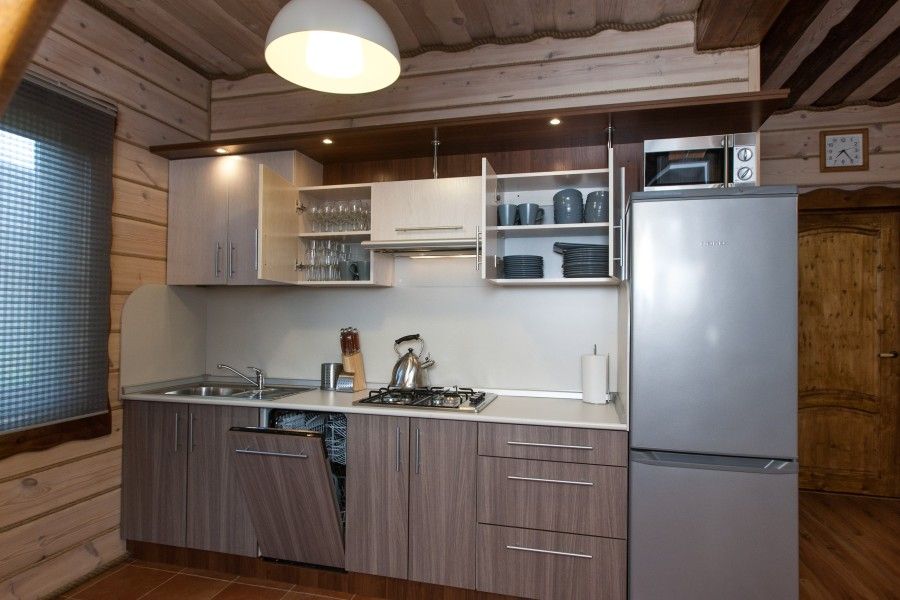 Кухонный блок: холодильник, газовая плита, чайник, микроволновая печь, кухонная и столовая посуда, посудомоечная машина.