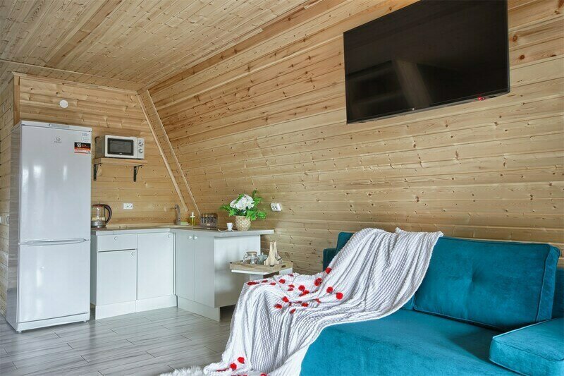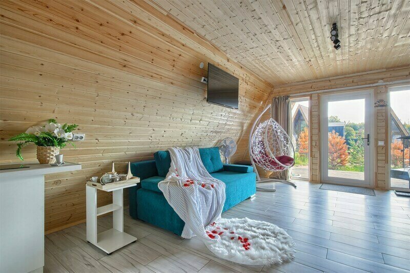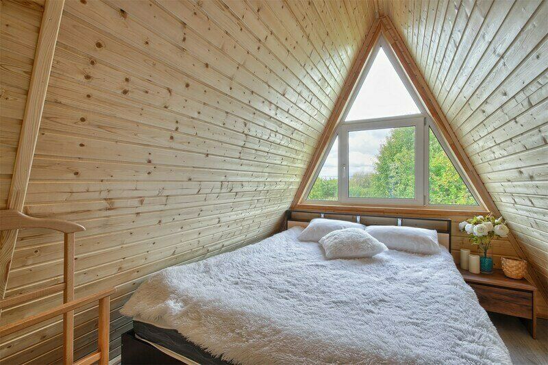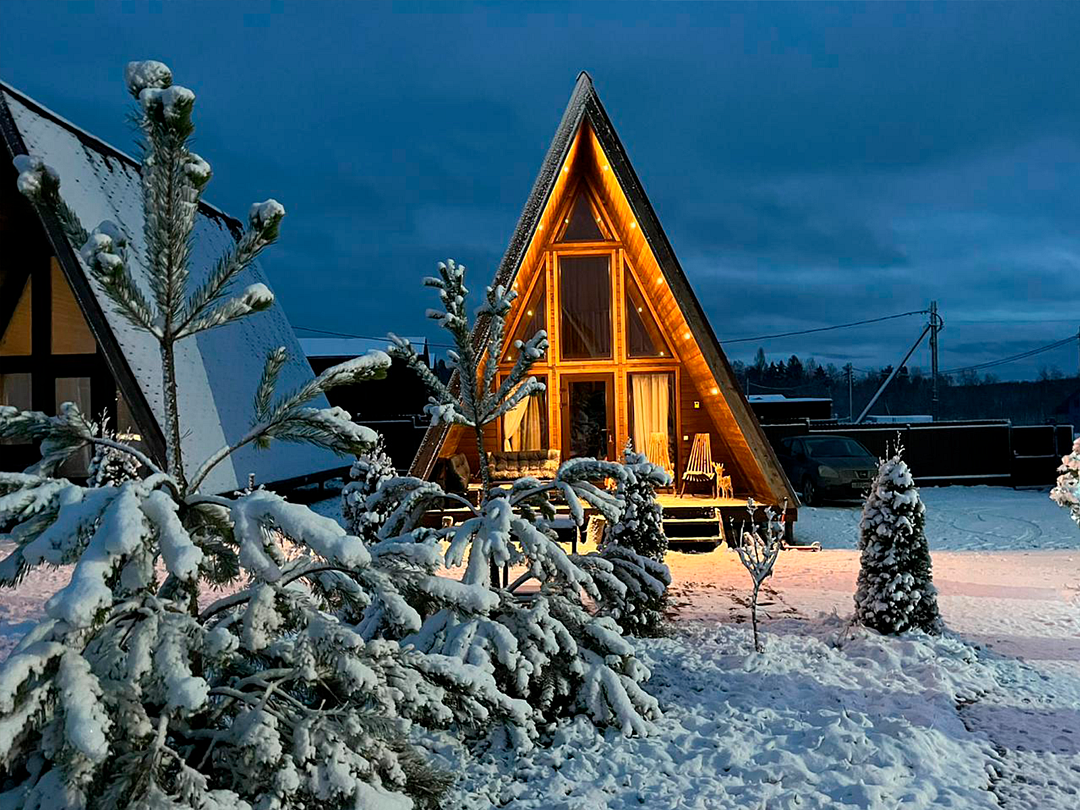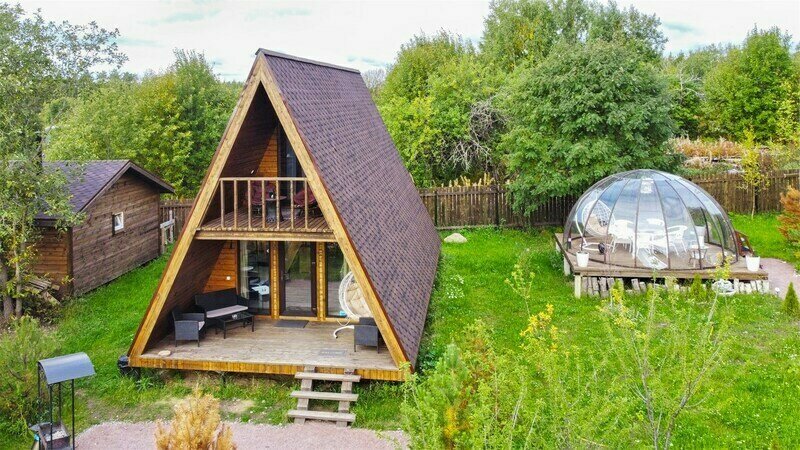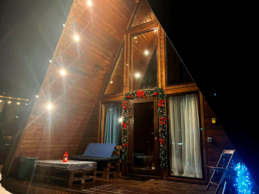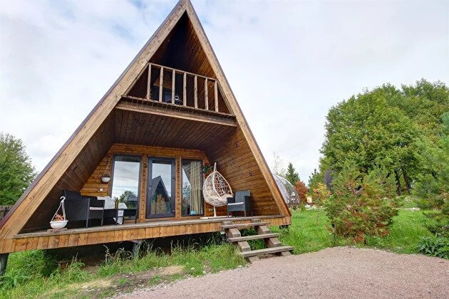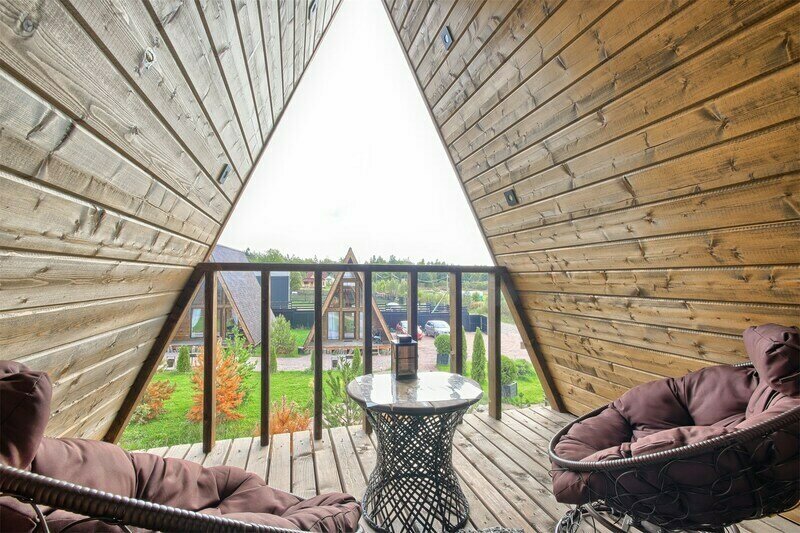 Треугольный дизайнерский домик— шале большое с балконом (вместимость до 10 человек), общая площадь 72 кв.м. Дом для отдыха полностью выполнен из дерева и оборудован для комфортного отдыха. В доме теплые водяные полы с датчиком регулировки температуры, настенный кварцевый обогреватель, вентилятор, установлен бойлер, современный экологический септик.