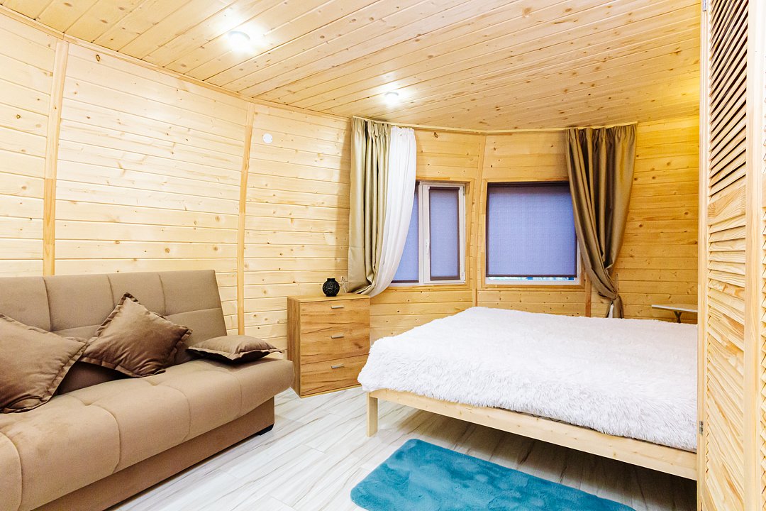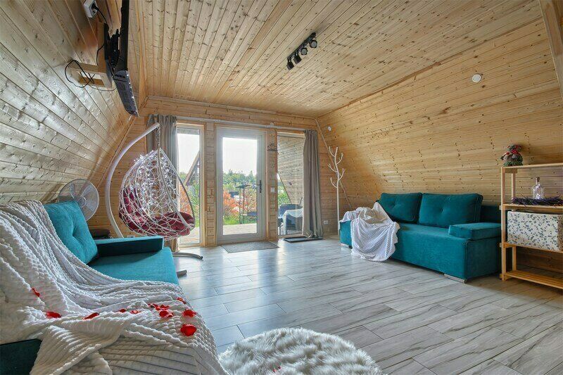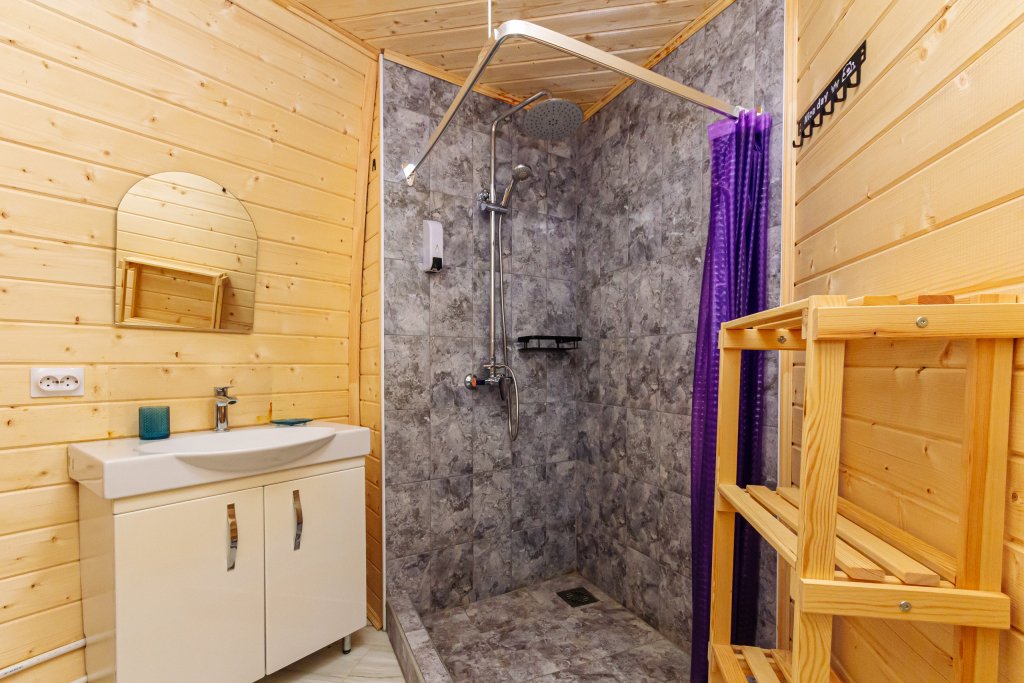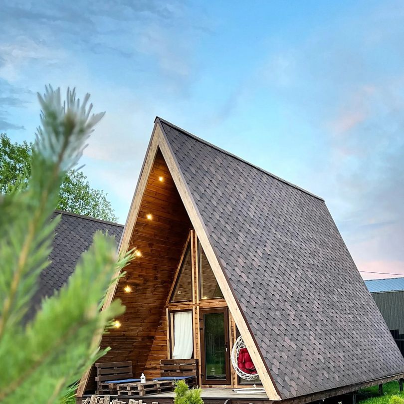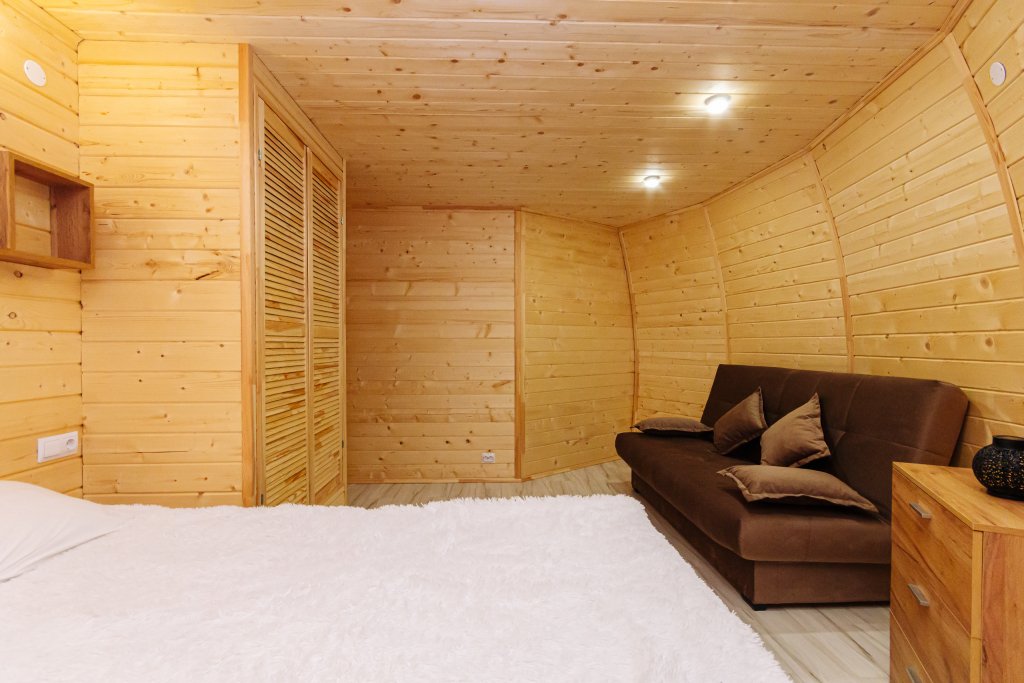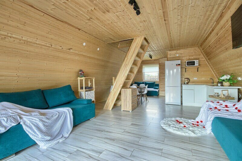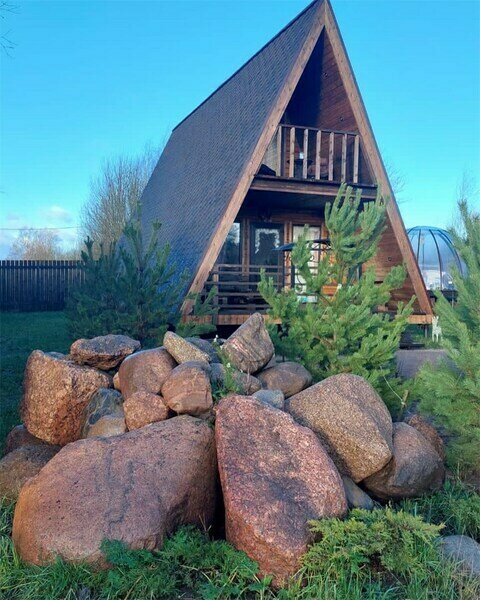 Треугольный дизайнерский домик— шале большое с балконом (вместимость до 10 человек), общая площадь 72 кв.м. Дом для отдыха полностью выполнен из дерева и оборудован для комфортного отдыха. В доме теплые водяные полы с датчиком регулировки температуры, настенный кварцевый обогреватель, вентилятор, установлен бойлер, современный экологический септик.