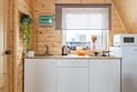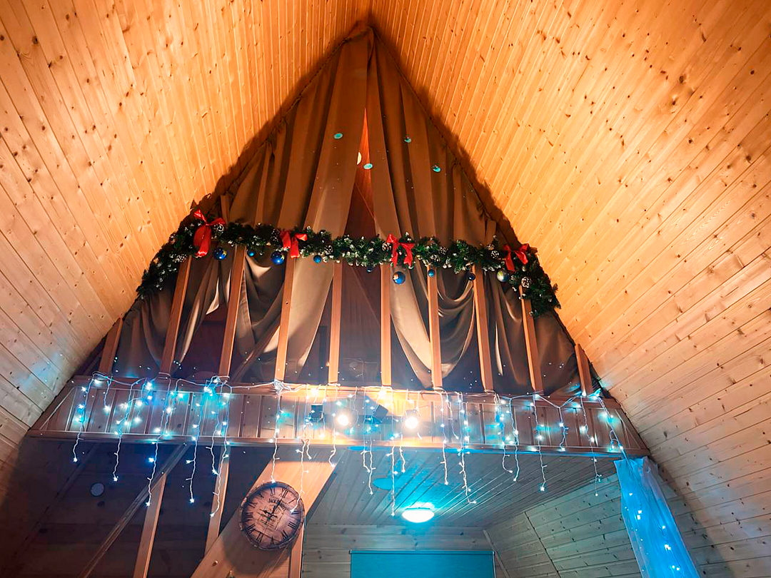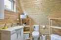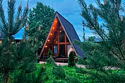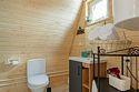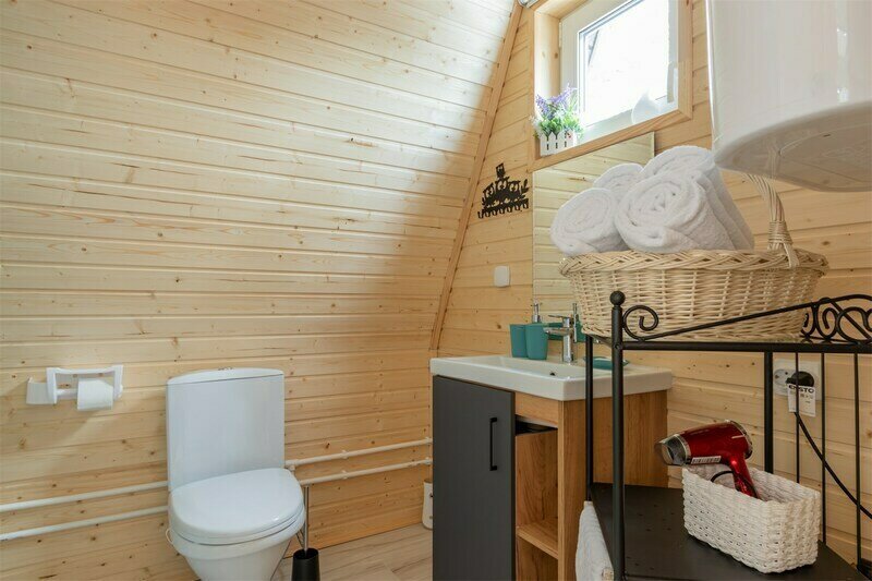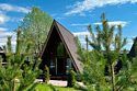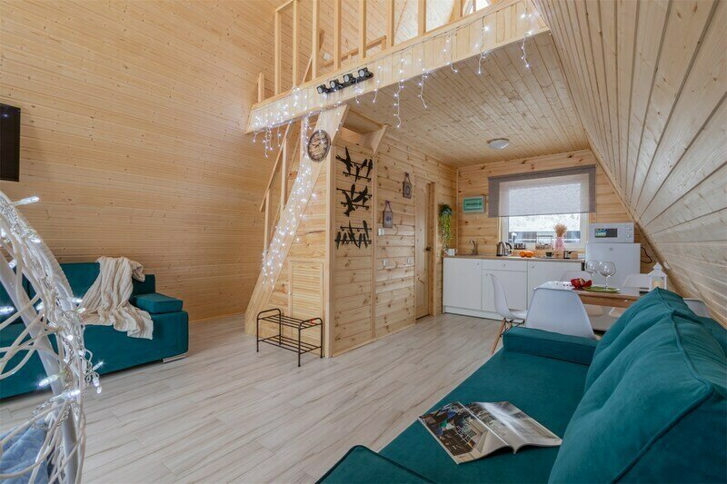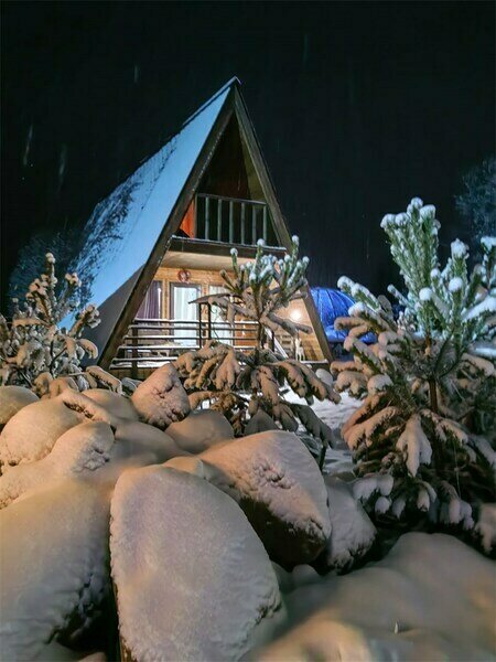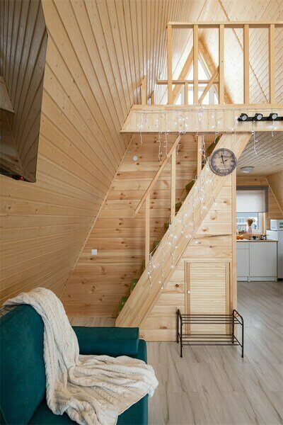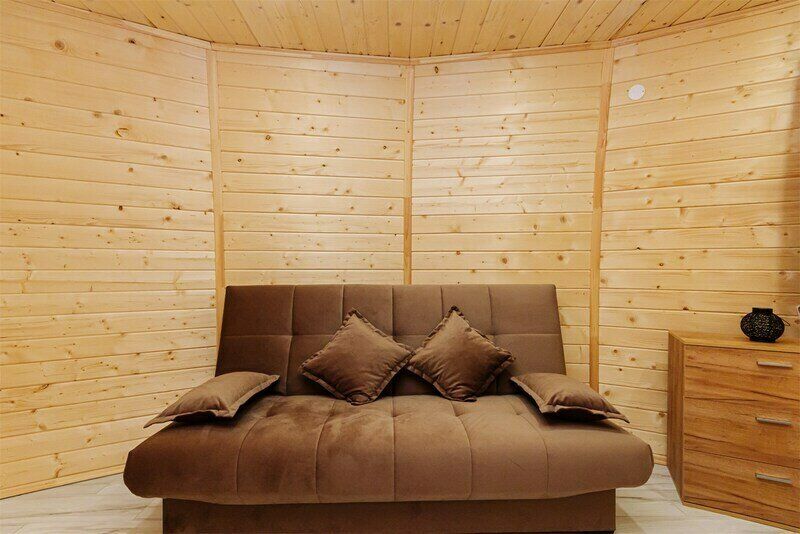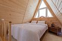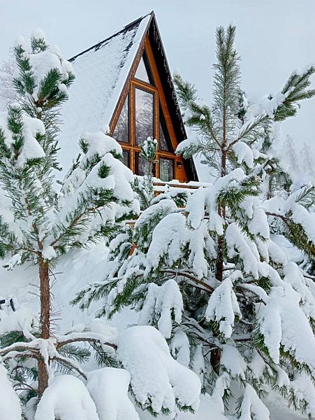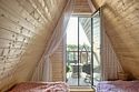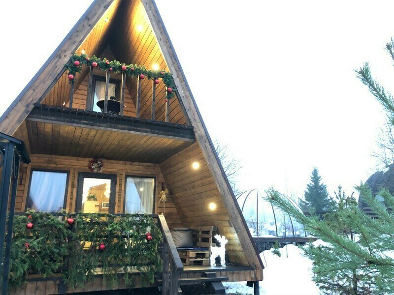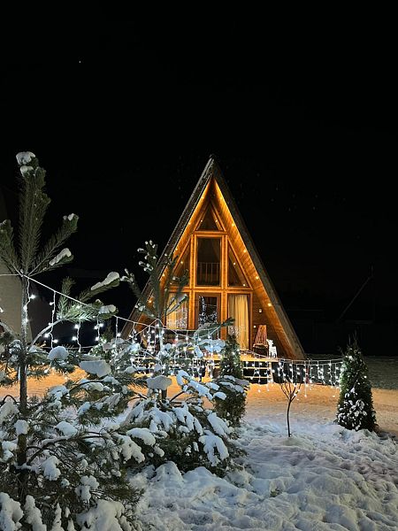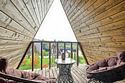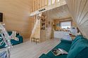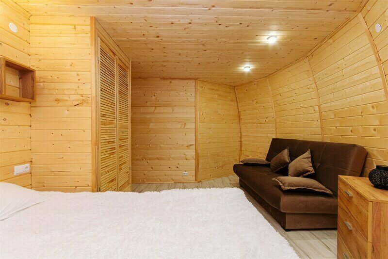 Треугольный дизайнерский домик— шале большое с балконом (вместимость до 10 человек), общая площадь 72 кв.м. Дом для отдыха полностью выполнен из дерева и оборудован для комфортного отдыха. В доме теплые водяные полы с датчиком регулировки температуры, настенный кварцевый обогреватель, вентилятор, установлен бойлер, современный экологический септик.