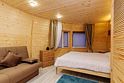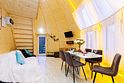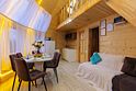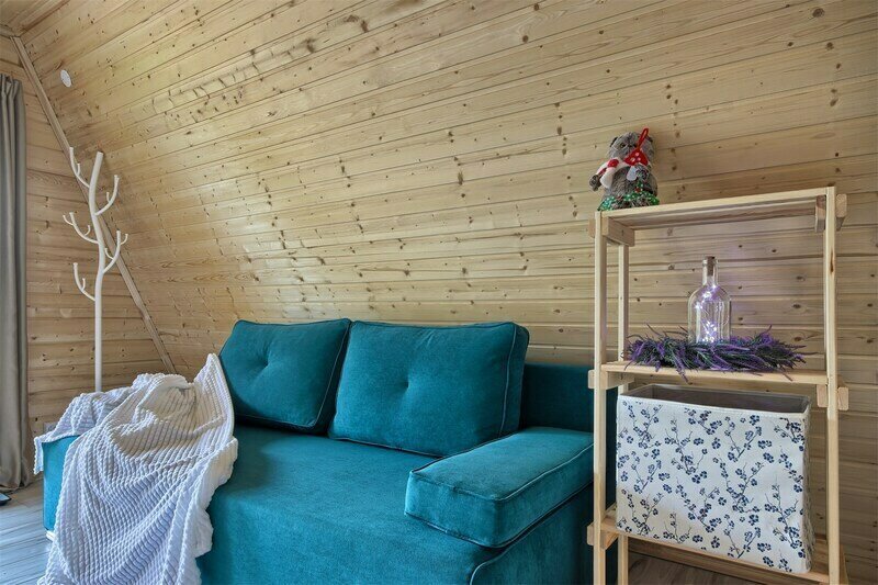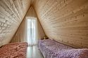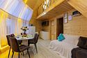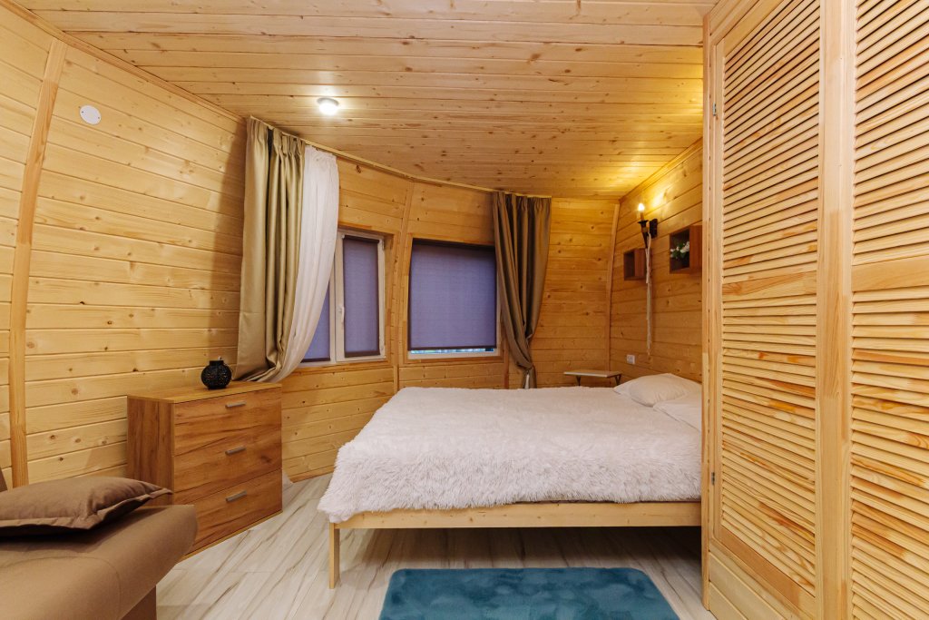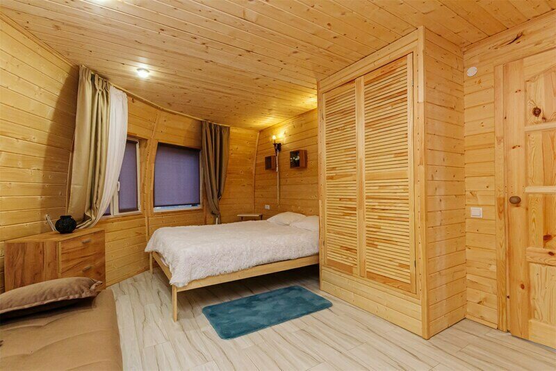 Треугольный дизайнерский домик— шале №3 (вместимость до 6 человек), общая площадь 52 кв.м. Дом для отдыха полностью выполнен из дерева и оборудован для комфортного отдыха. В доме теплые водяные полы с датчиком регулировки температуры, настенный кварцевый обогреватель, вентилятор, установлен бойлер, современный экологический септик. Весь декор в доме ручной работы.