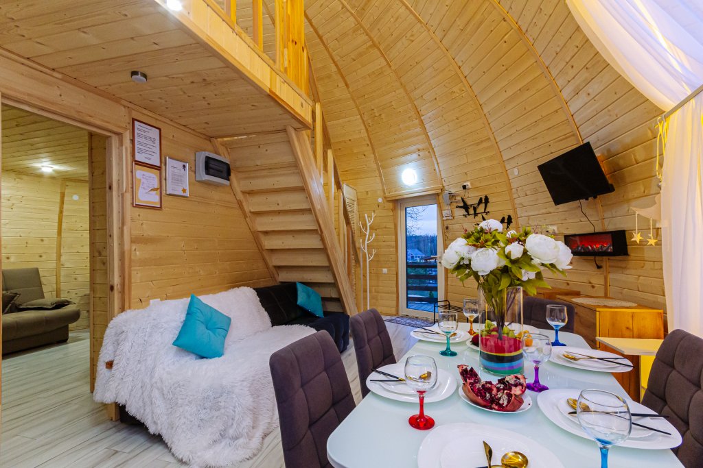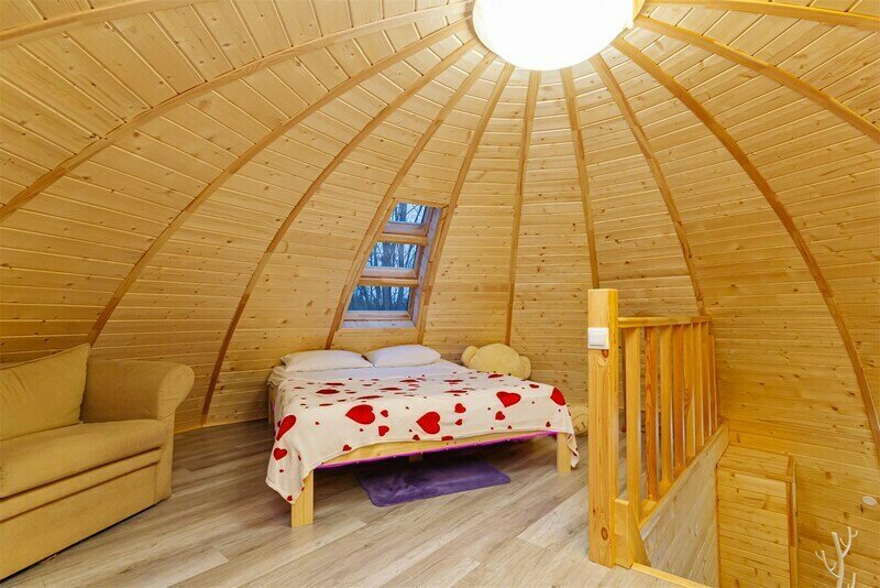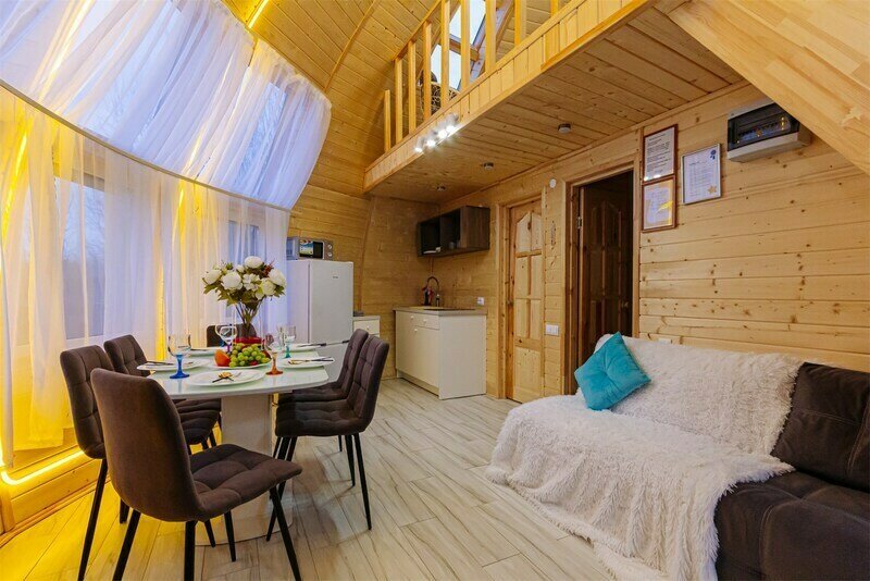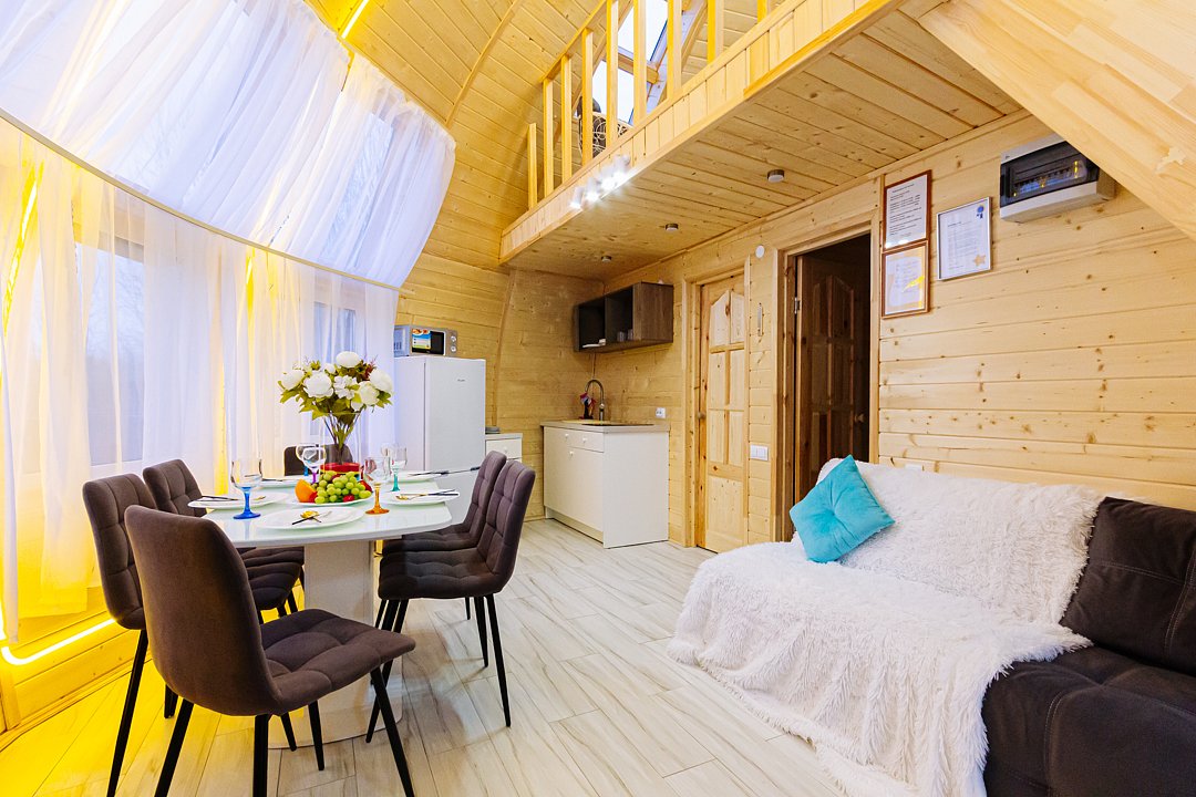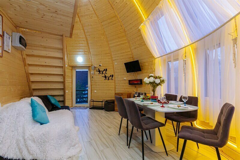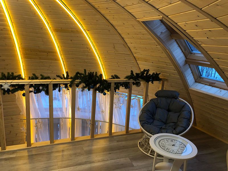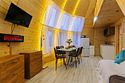 Купольный дом №1- шале с крытой террасой по периметру полностью оборудован для комфортного отдыха, декодер- дерево, также в доме присутствует изюминка в виде дизайнерского освещения. В доме теплые водяные полы с датчиком регулировки температуры, настенный кварцевый обогреватель, вентилятор, установлен бойлер, современный экологический септик.