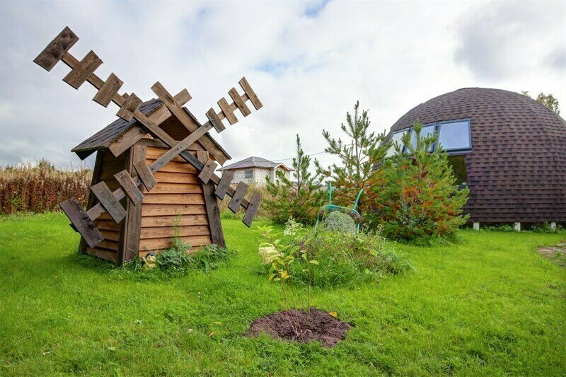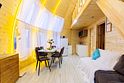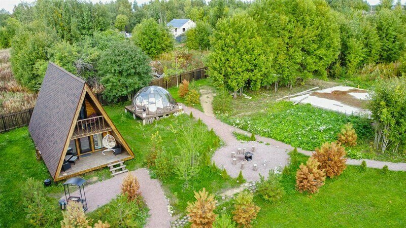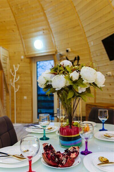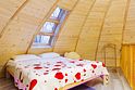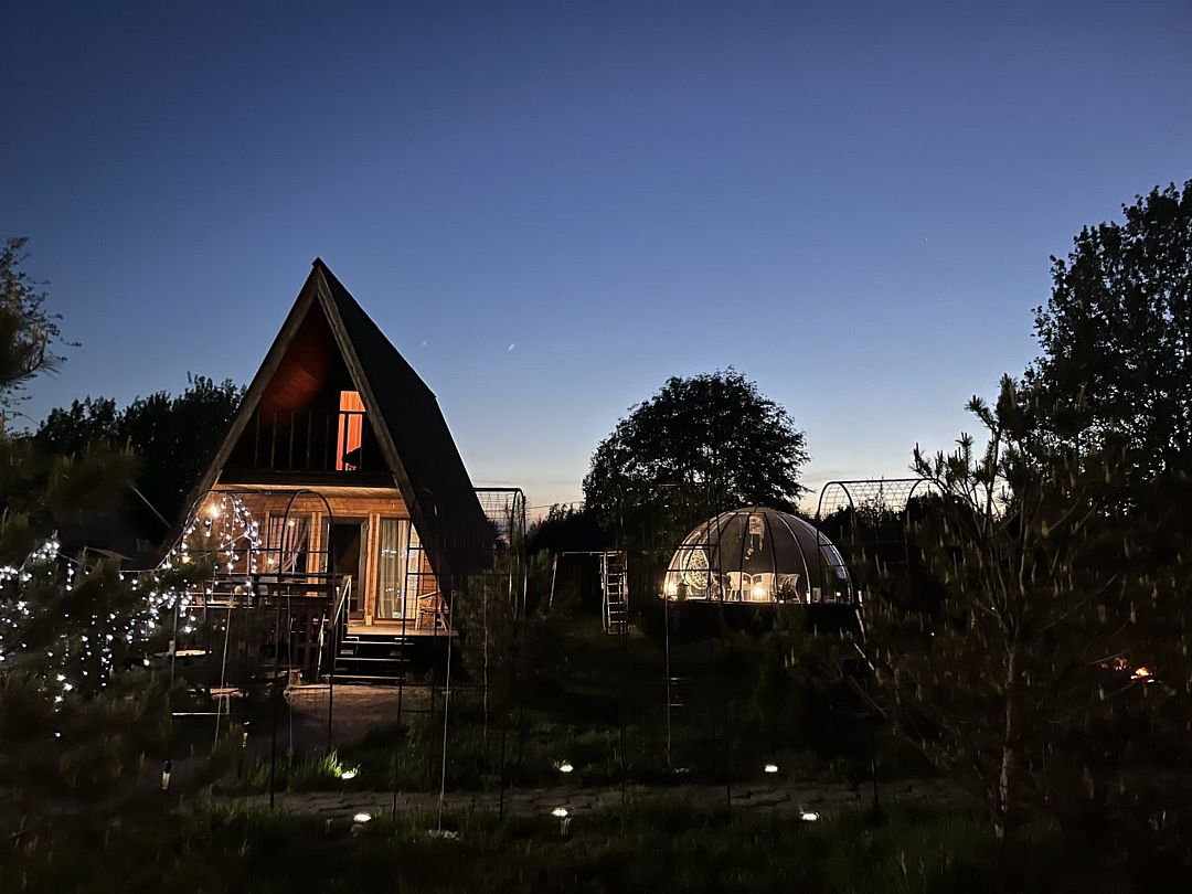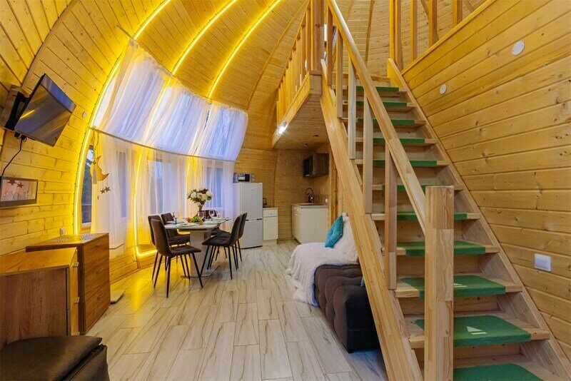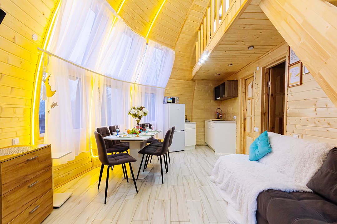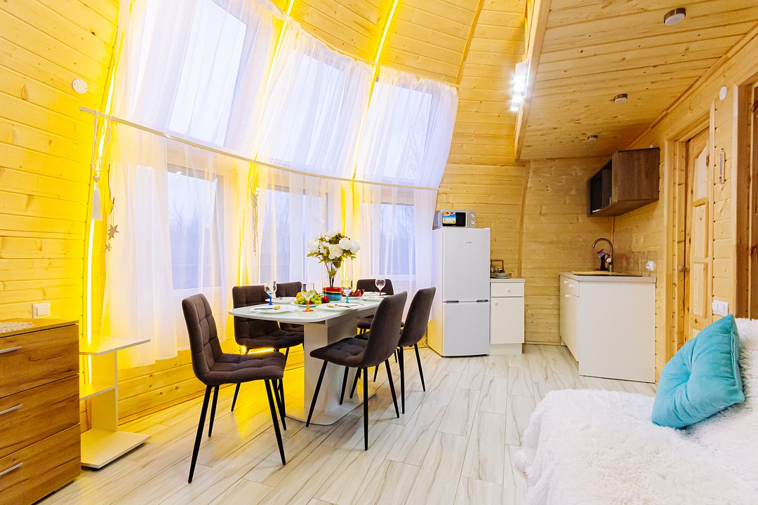 Купольный дом №1- шале с крытой террасой по периметру полностью оборудован для комфортного отдыха, декодер- дерево, также в доме присутствует изюминка в виде дизайнерского освещения. В доме теплые водяные полы с датчиком регулировки температуры, настенный кварцевый обогреватель, вентилятор, установлен бойлер, современный экологический септик.