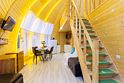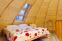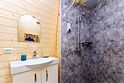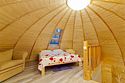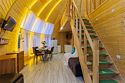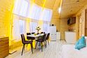 Купольный дом №2- шале с крытой террасой по периметру (вместимость до 9 человек), общая площадь 64 кв.м. Дом полностью оборудован для комфортного отдыха, декодер- дерево, также в доме присутствует изюминка в виде дизайнерского освещения. В доме теплые водяные полы с датчиком регулировки температуры, настенный кварцевый обогреватель, кондиционер, установлен бойлер, современный экологический септик.