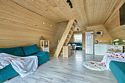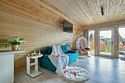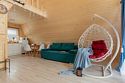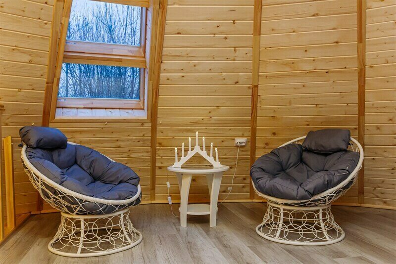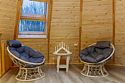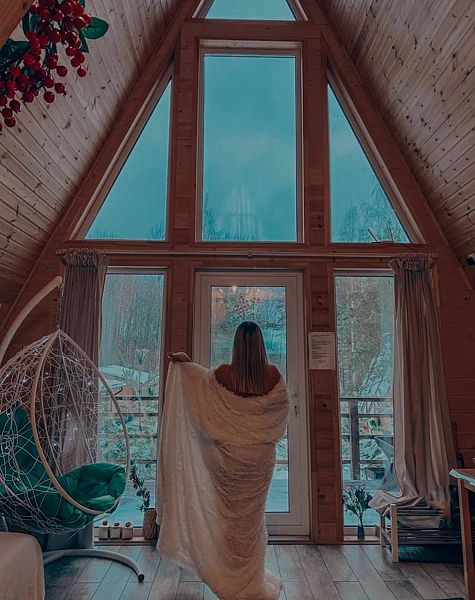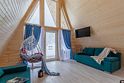 - Гостиная с панорамными окнами в пол с видом на лес (в гостиной: ЖК телевизор, подвесное кресло/кокон с подсветкой, три дивана/кровати с независимыми пружинными блоками и ортопедическим основанием,