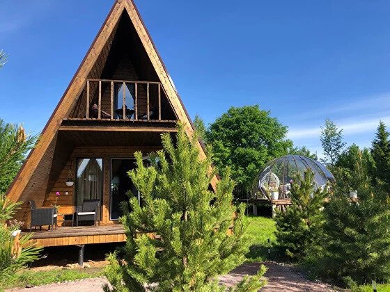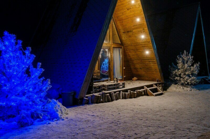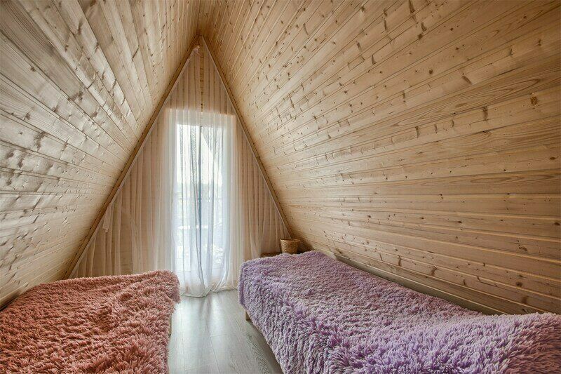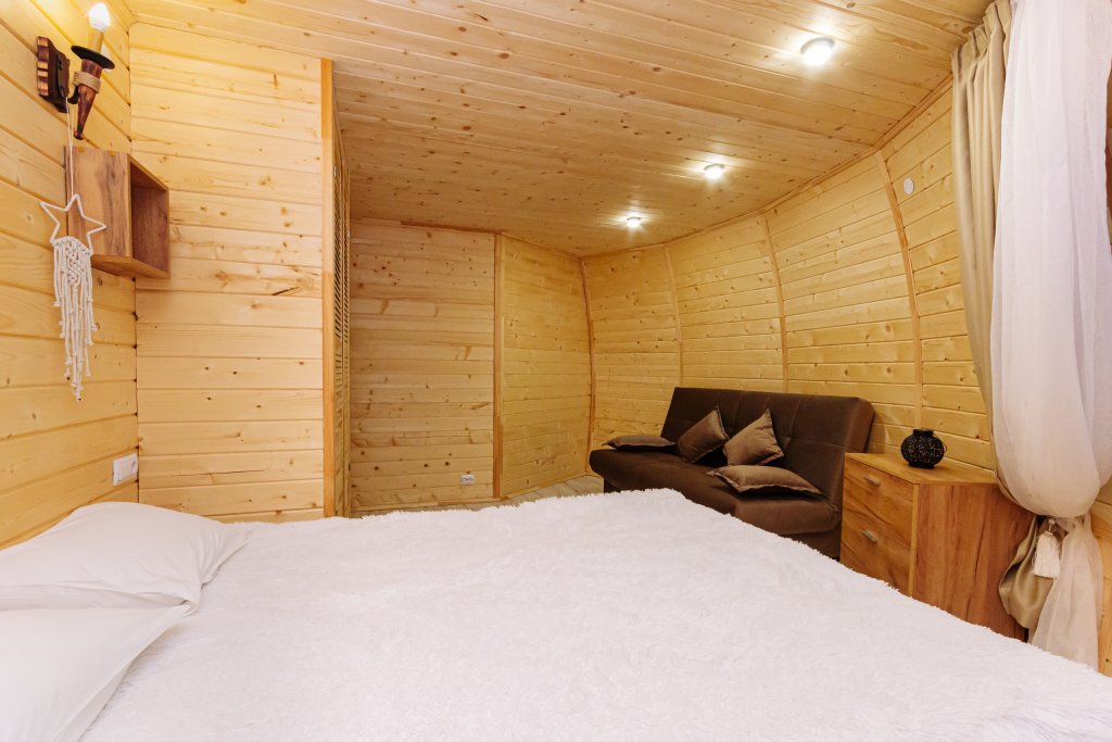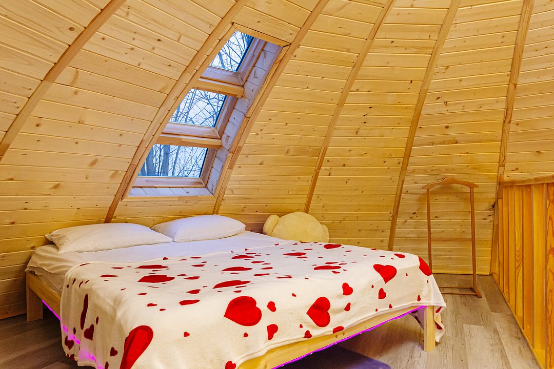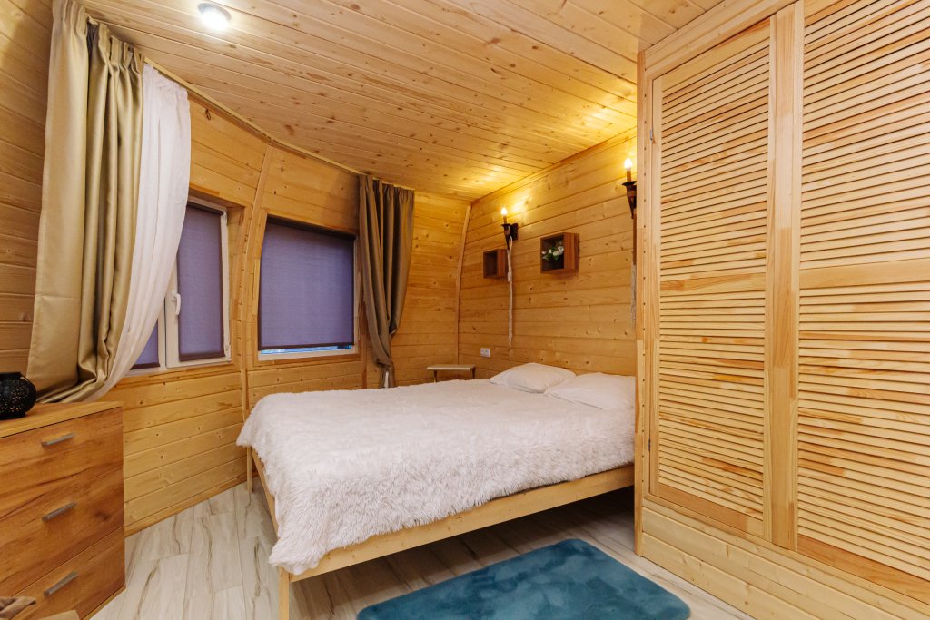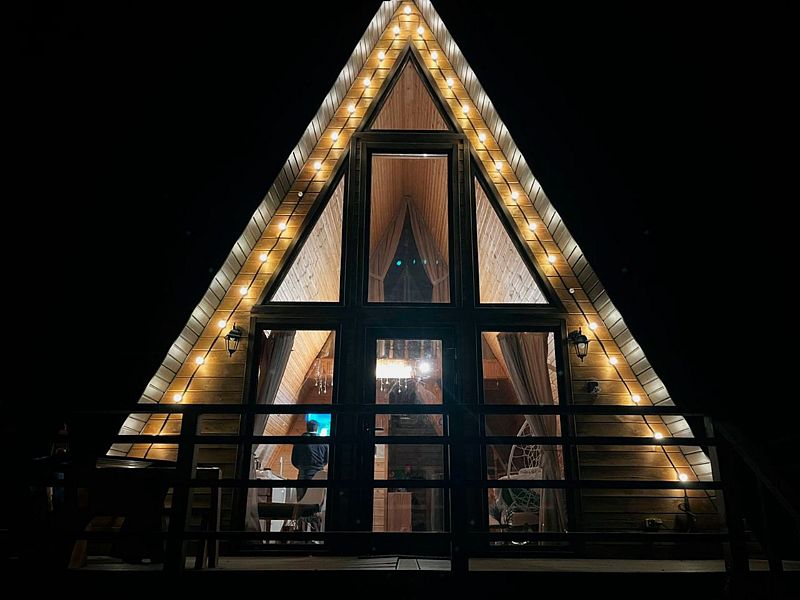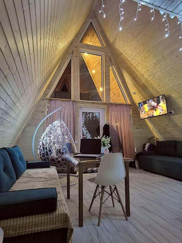 Треугольный дизайнерский домик— шале №1 (вместимость до 6 человек), общая площадь 52 кв.м. Дом для отдыха полностью выполнен из дерева и оборудован для комфортного отдыха. В доме теплые водяные полы с датчиком регулировки температуры, настенный кварцевый обогреватель, вентилятор, установлен бойлер, современный экологический септик. Весь декор в доме ручной работы.