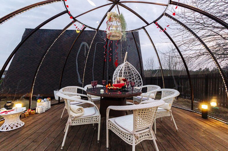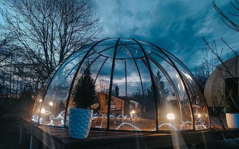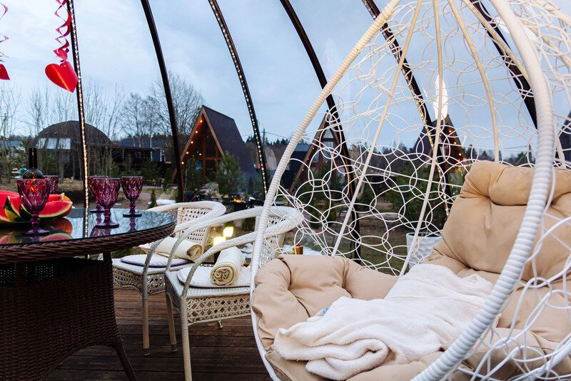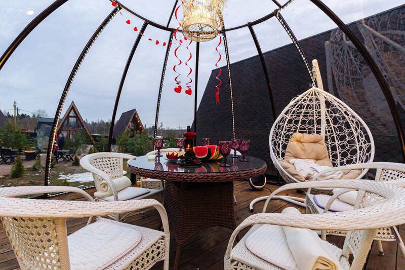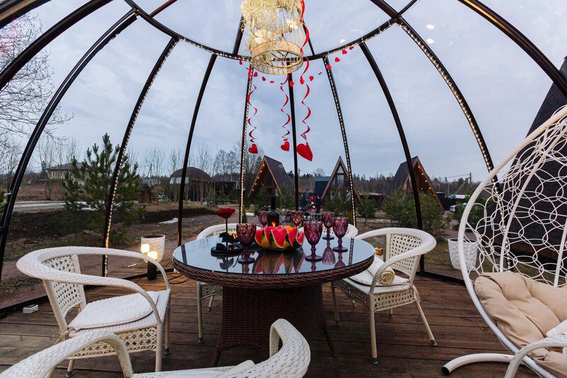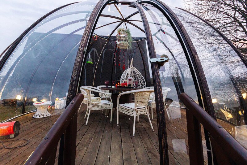 Купольная прозрачная беседка полностью оборудована для комфортного отдыха. Беседка утеплена, подогревается обогревателем в зимний период.