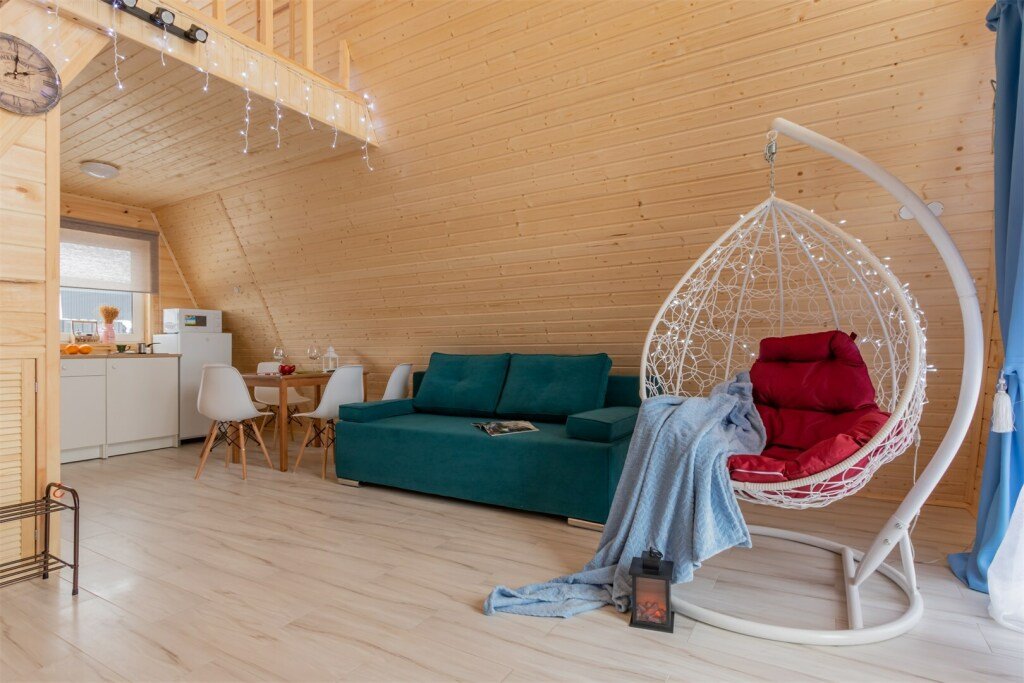 - Гостиная с панорамными окнами в пол с видом на лес (в гостиной: ЖК телевизор, подвесное кресло/кокон с подсветкой, два дивана/кровати с независимыми пружинными блоками и ортопедическим основанием, комод);