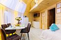 - Мини-кухня (большой раскладной обеденный стол и стулья, холодильник, микроволновая печь, набор посуды/утвари для приготовления еды и красивой сервировки стола, электрический чайник, электрическая плита, средства для мытья посуды, губки, кухонные полотенца);