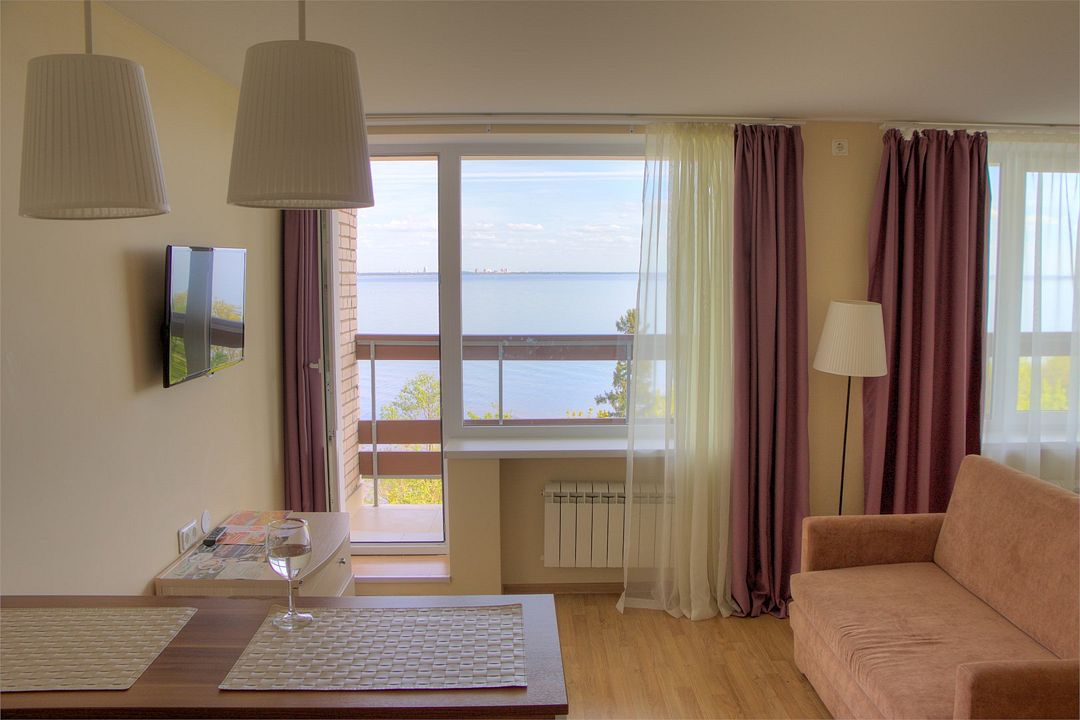 телевизор, Wi-Fi, светильник, фен, электронные замки, микроволновая печь, душевая кабина, теплый пол, халаты, банные полотенца, тапочки, гигиенические средства, балкон, кровать «King size», диван, стулья, шкаф для одежды, вешалки, обеденный стол, зеркало, комод, набор посуды, информационная карта, меню, чайник, унитаз, раковина, обеденная зона, гостиная зона, кулер на этаже, ламинат, кухонная посуда, стаканы, столовые приборы, мини-холодильник, мини-кухня, кухонный уголок, вид на залив, можно с питомцамиВ гостиничном номере