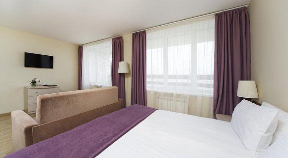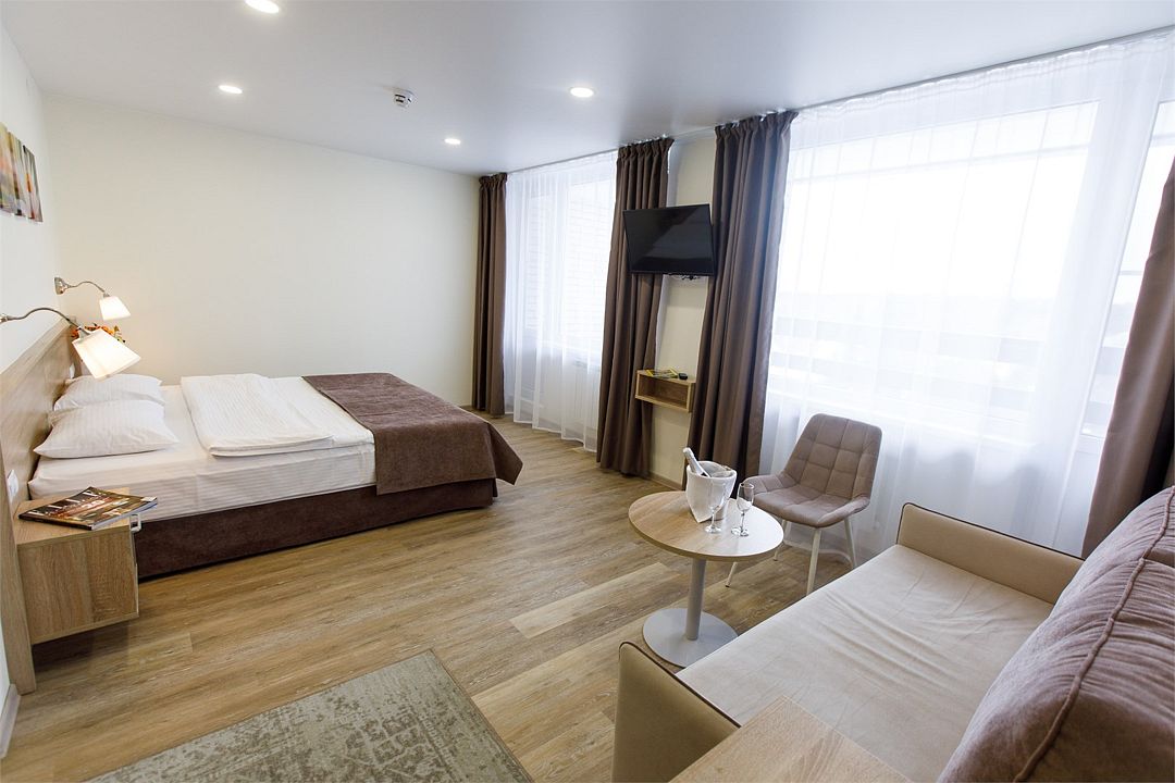 телевизор, Wi-Fi, фен, электронные замки, душевая кабина, балкон, кровать «King size», две односпальные кровати, шкаф для одежды, вешалки, письменный стол, зеркало, информационная карта, меню, вид на город, стаканы, туалетные средства, номер для некурящих, холодильный шкаф, можно с питомцамиВ гостиничном номере