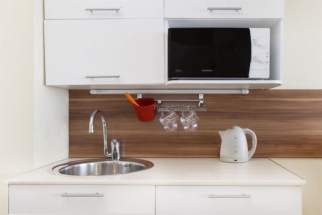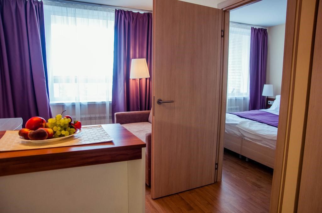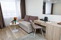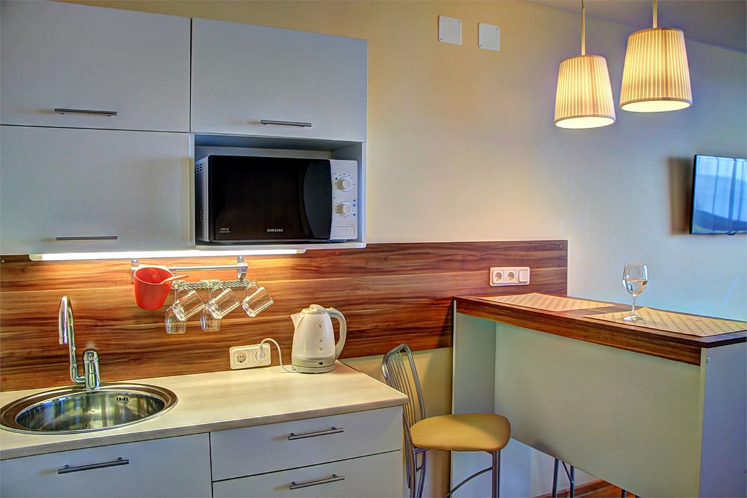 телевизор, Wi-Fi, светильник, фен, электронные замки, микроволновая печь, душевая кабина, теплый пол, халаты, банные полотенца, тапочки, гигиенические средства, балкон, кровать «King size», диван, стулья, шкаф для одежды, вешалки, обеденный стол, зеркало, комод, набор посуды, информационная карта, меню, чайник, унитаз, раковина, обеденная зона, гостиная зона, вид на город, кулер на этаже, ламинат, кухонная посуда, стаканы, столовые приборы, мини-холодильник, мини-кухня, кухонный уголок, можно с питомцамиВ гостиничном номере