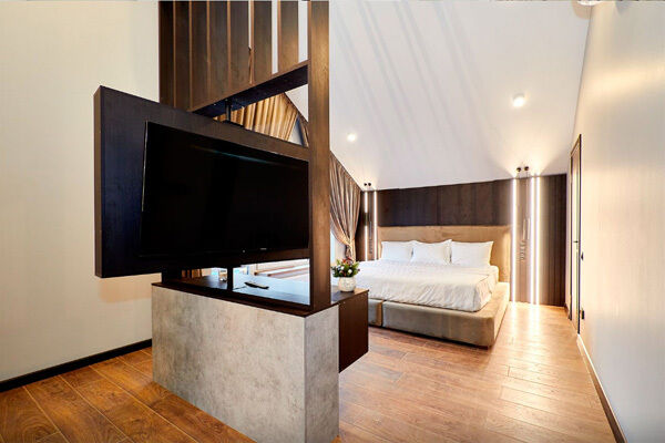 Проживание организовано в уютных резиденциях с современным дизайном и планировкой. Каждая резиденция расположена на отдельном участке, на территории которого есть собственная круглогодичная купель. В резиденции 5 спален, в каждой из которых есть телевизор и кондиционер, 3 ванных комнаты, просторная кухня-гостиная с большим ЖК-телевизором, набор постельного белья и полотенец, фен, кофемашина, приставка PS4 и высокоскоростной Wi-Fi.