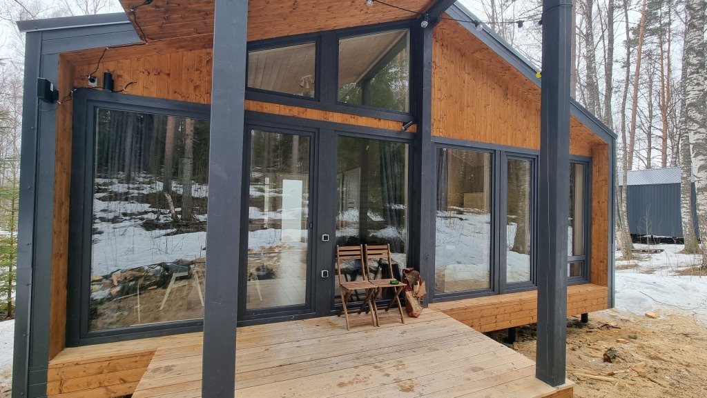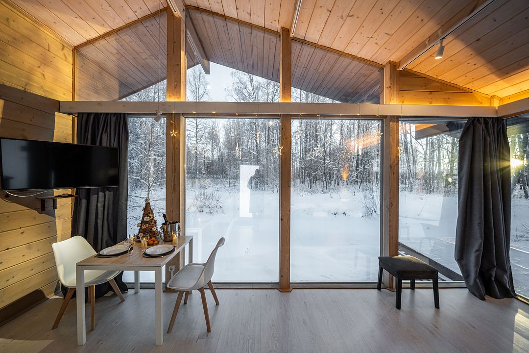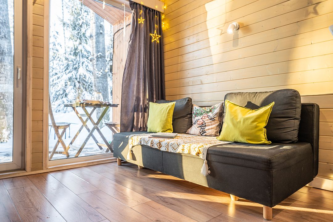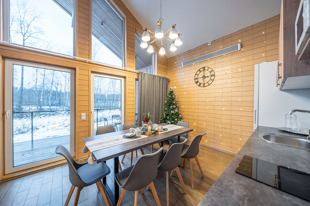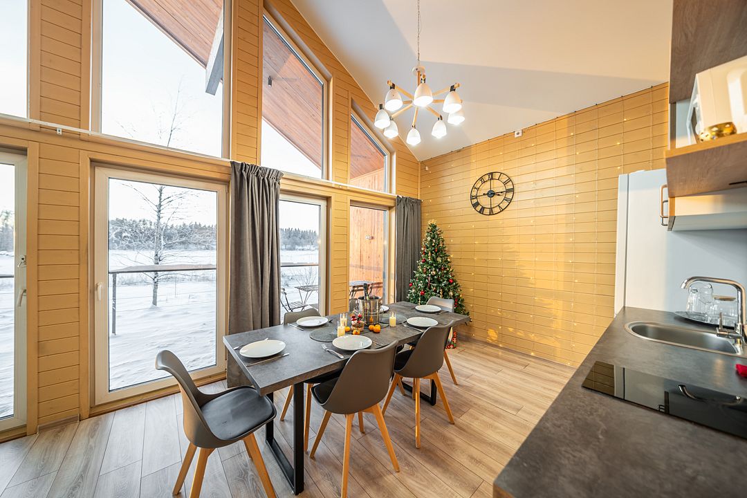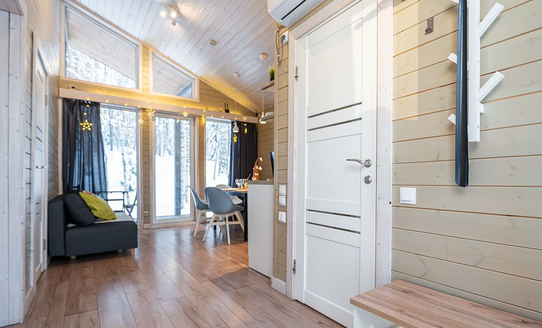 Из окон открывается прекрасный вид на о. Вуокса и лес. В 300 м находится уединенный пляж, где можно половить рыбу, искупаться и насладиться красотой природы Карельского перешейка. В интерьере домика гармонично сочетается простота с натуральными материалами в декоре.