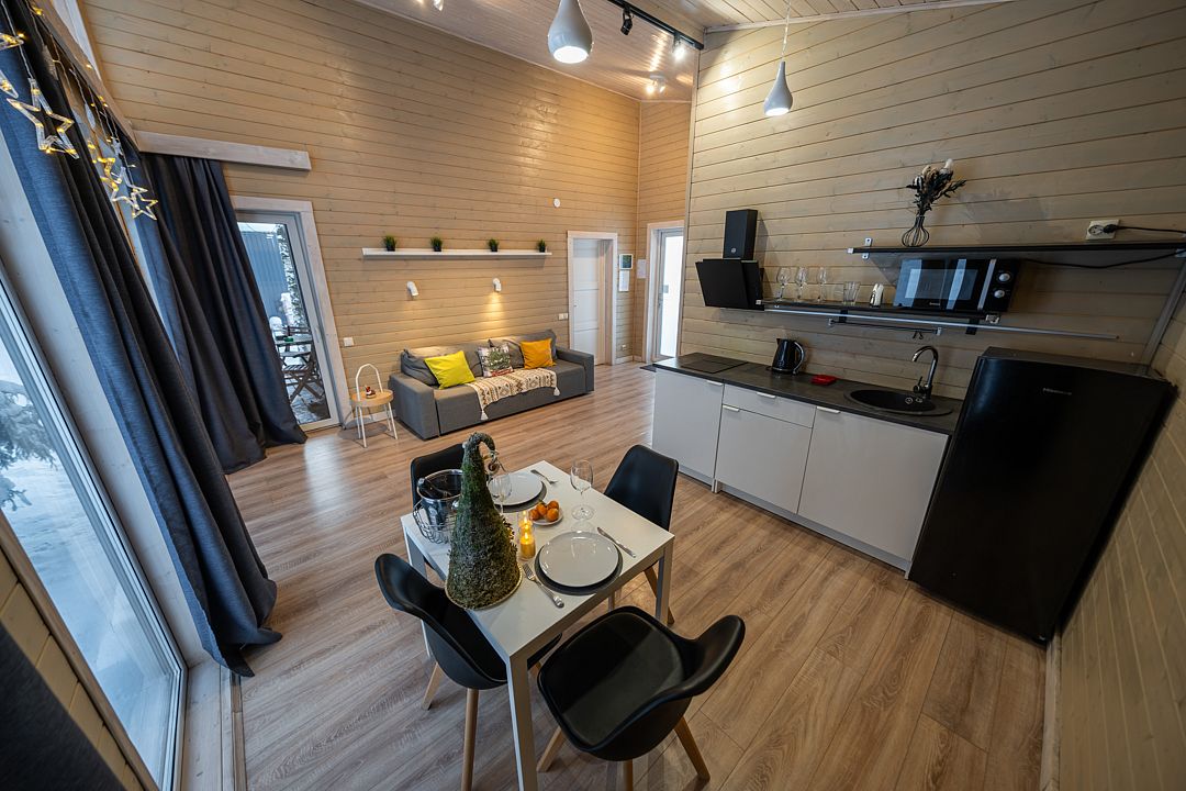Гостям предлагаются различные варианты размещения в современных коттеджах на берегу реки. Во всех номерах имеется отопление, централизованное холодное и горячее водоснабжение, ванные комнаты с душевыми кабинами, полностью оборудованные мини-кухни (холодильник, микроволновая печь, электрический чайник, посуда), телефоны внутреннего пользования, спутниковое телевидение и Wi-Fi. Всех проголодавшихся всегда рады накормить вкусной домашней едой.