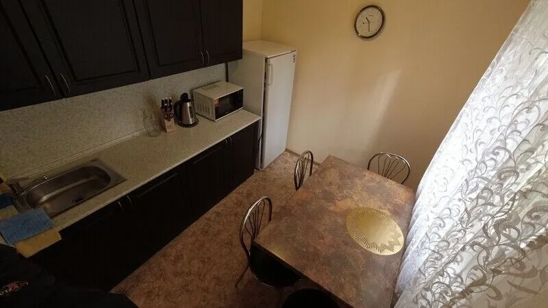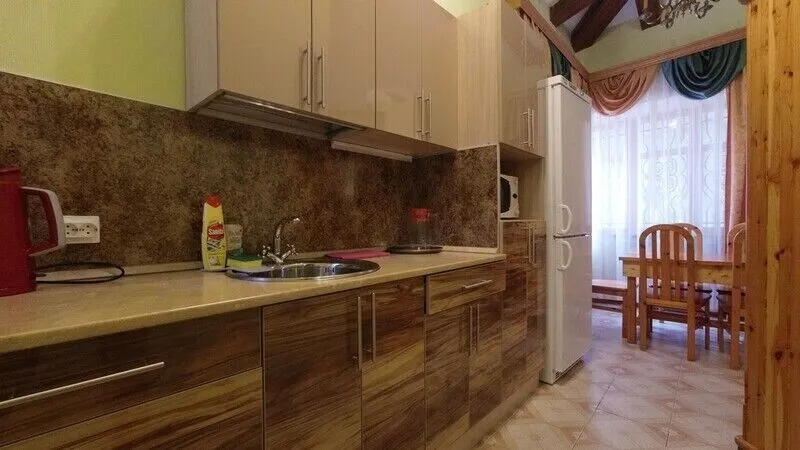 кухню с посудой, холодильником и СВЧ-печью, чайником,