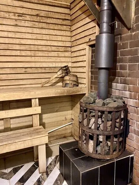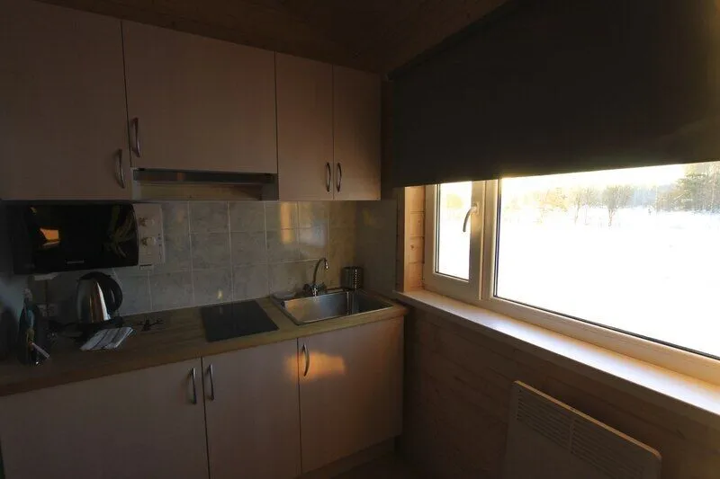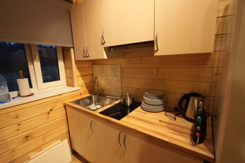Полностью оснащенная всей необходимой бытовой техникой кухня: мебель, холодильник, микроволновая печь, электрочайник, плитка, столовая посуда, большая чугунная печка;