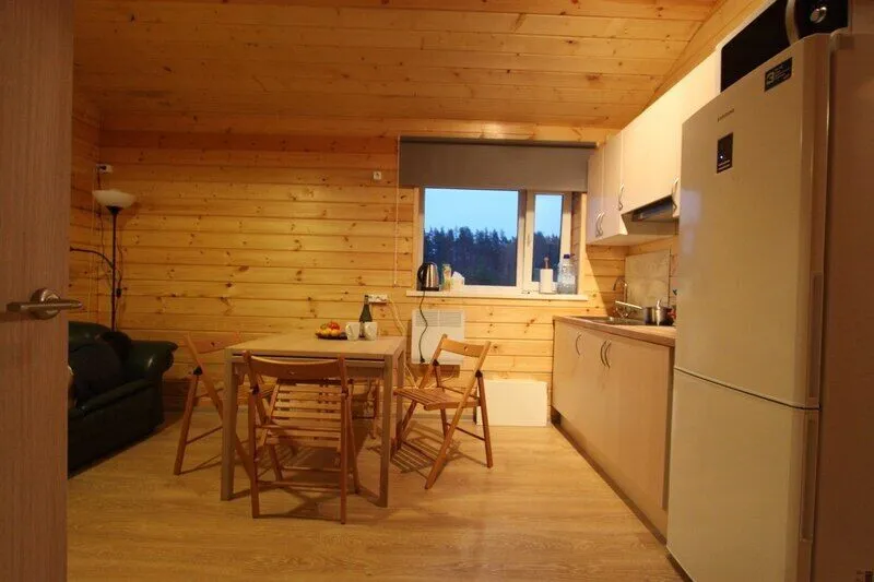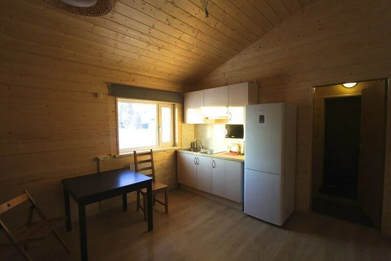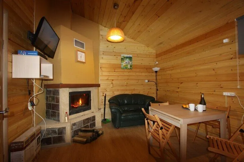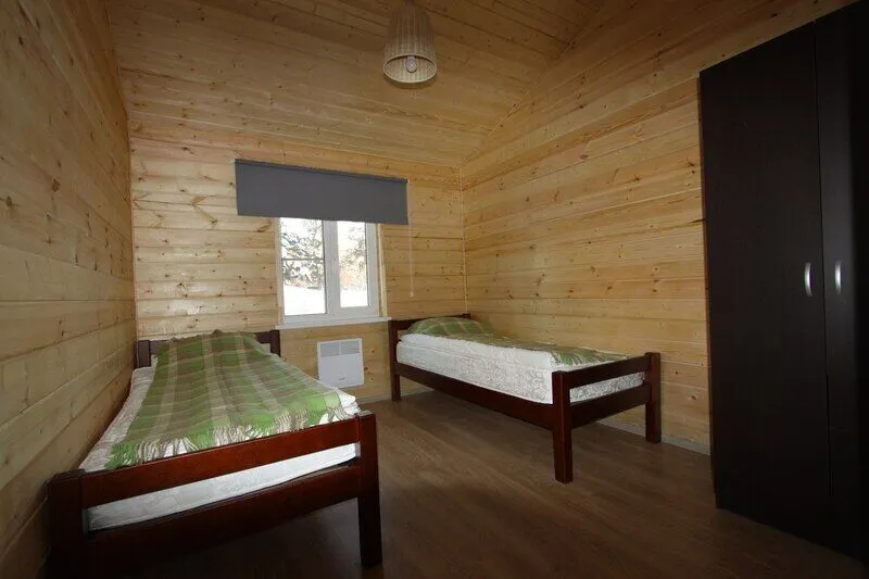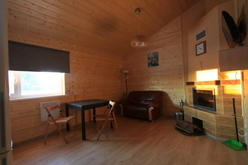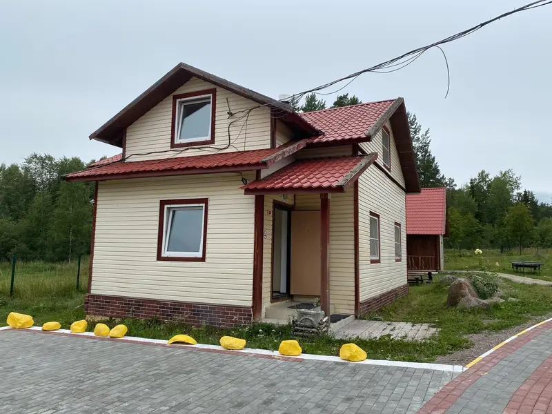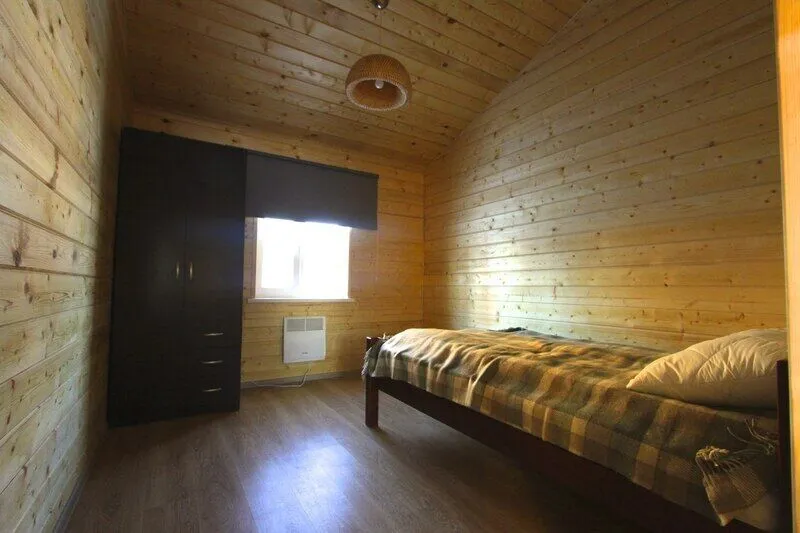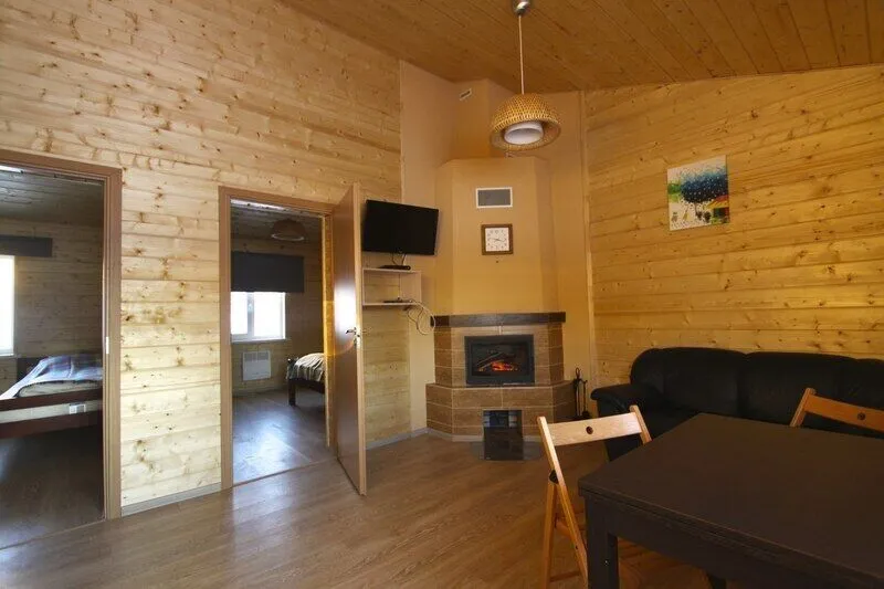 Двухэтажный дом на 6-8 человек площадью 110 кв. м. На 1-ом этаже расположены кухня-гостиная с камином, совмещенная со спальней и санузел с ванной; на 2-ом этаже – холл, две отдельные спальные комнаты и туалет.