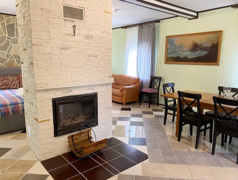 Совмещенная с кухней гостиная: камин, удобный кожаный диванчик, стол, стулья, LCD - телевизор с ресивером спутниковых каналов Триколор.