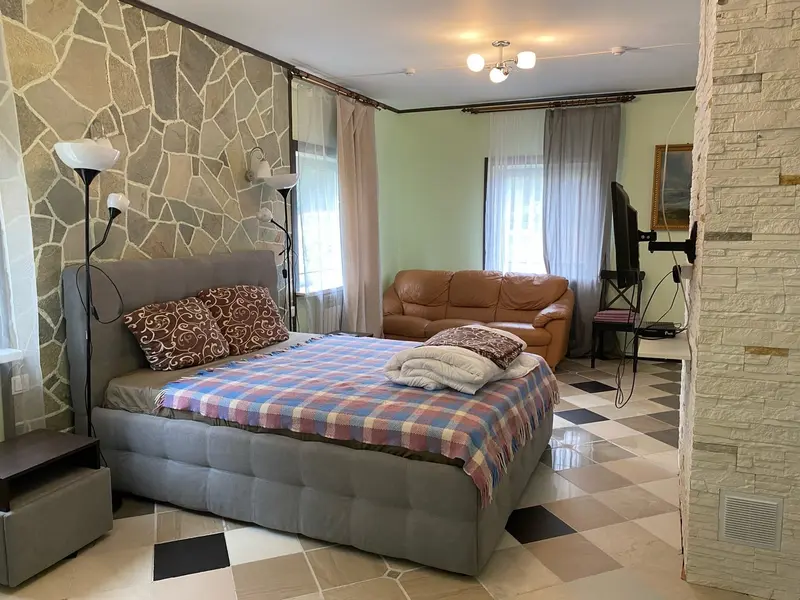- совмещенная с гостиной спалья с большой двуспальной кроватью и телевизором;