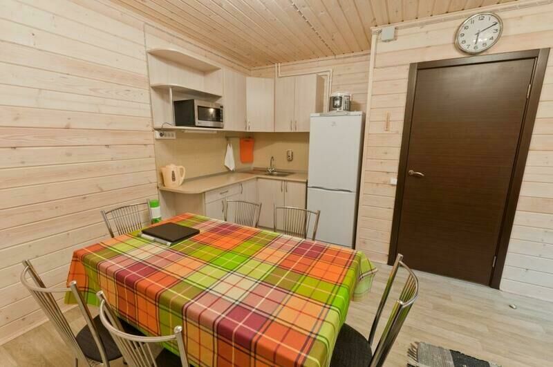 Двухэтажный коттедж с гостиной-столовой и 2-мя спальными комнатами. На первом этаже гостиная с раскладывающимся двуспальным диваном и телевизором со спутниковым телевидением, обеденным столом и кухонным уголком, в котором есть полноценный холодильник, мультиварка, микроволновая печь, чайник, достаточное количество посуды и столовых приборов. Туалетная комната оборудована душевой кабиной, раковиной с зеркалом, унитазом. На втором этаже 2 спальные комнаты с кроватями и тумбочками. В одной двуспальная, а в другой полутороспальные кровати. Постельное белье, тапочки, полотенца, фен, мыло и шампуни предоставляются. На кухню и в туалетную комнату подаются холодная и горячая вода. Предусмотрено центральное отопление. Бесплатно доступен интернет Wi-Fi.