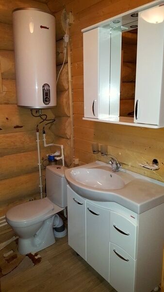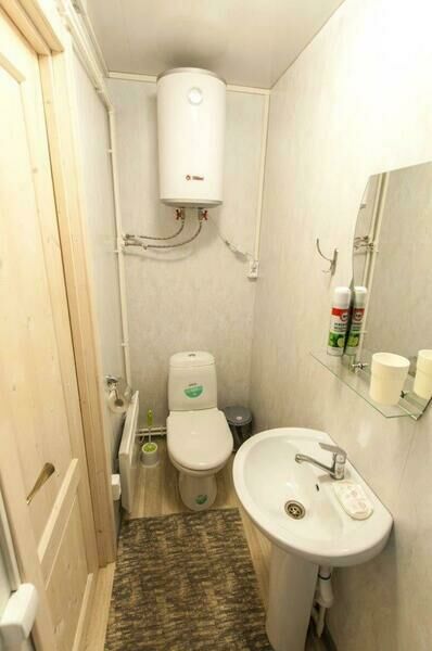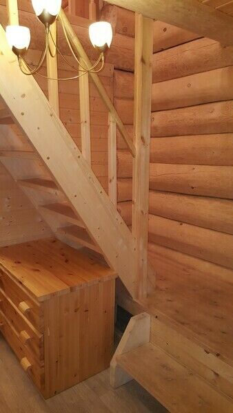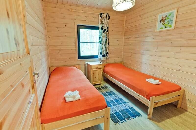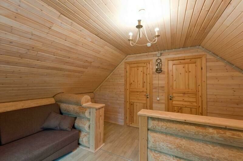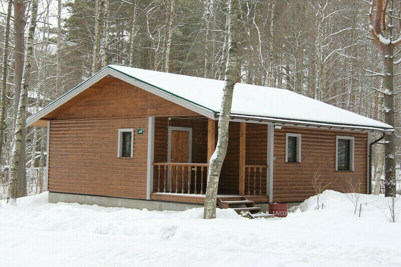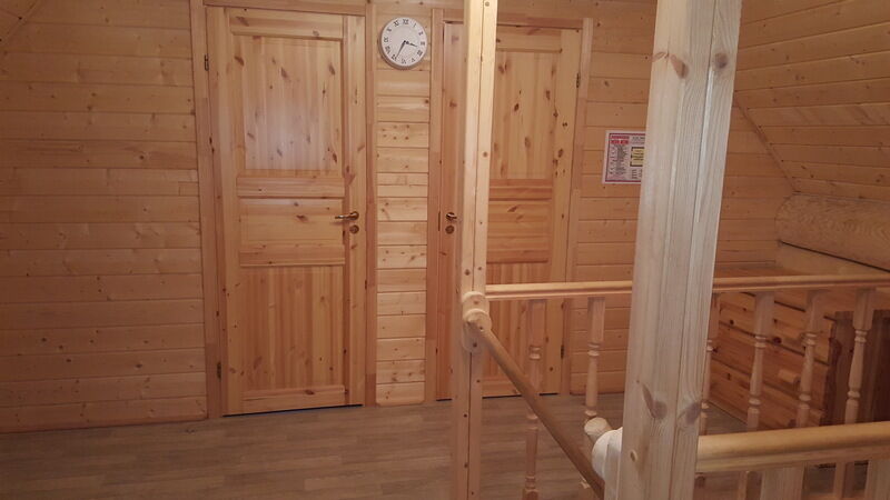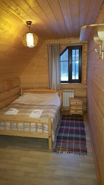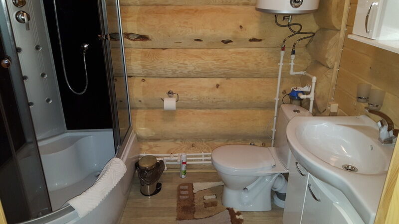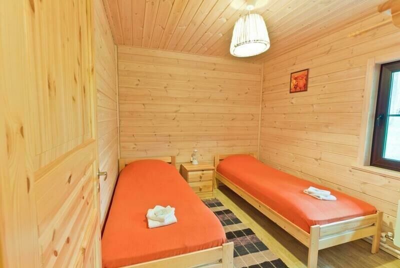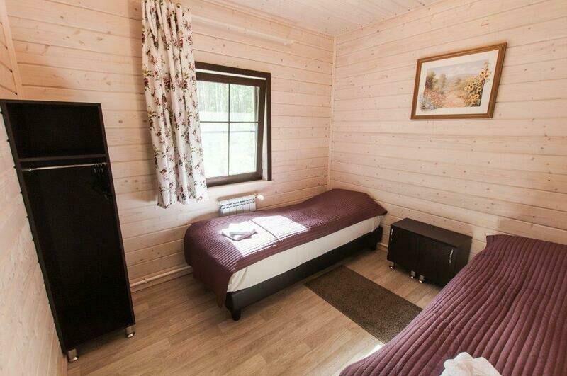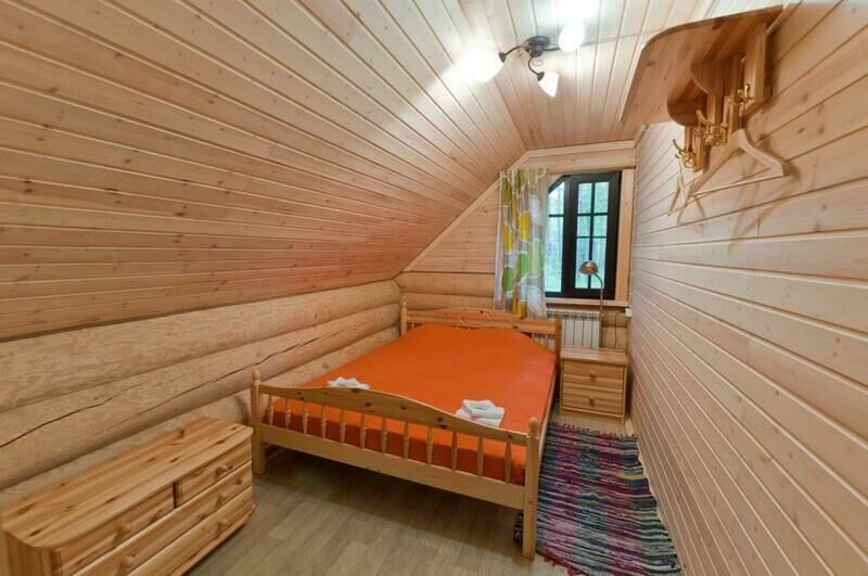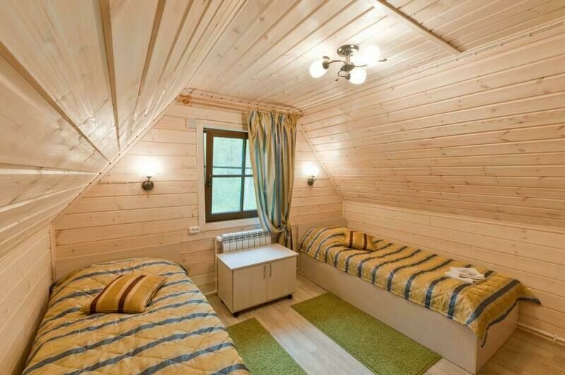 Двухэтажный коттедж с гостиной-столовой и 2-мя спальными комнатами. На первом этаже гостиная-студия с диваном на два спальных места, обеденным столом и мини-кухней, оборудованной холодильником, микроволновой печью, мультиваркой, электрическим чайником, а так же раковиной с горячей и холодной водой. Посуда и столовые приборы в наличии. Телевизор со спутниковой тарелкой. Туалетная комната с душевой кабиной, унитазом, раковиной, зеркалом, горячей и холодной водой. На втором этаже две спальных комнаты. В одной двухместная кровать с тумбочкой, в другой две полутороспальные кровати с двумя тумбочками. В холле второго этажа также диван на 2 места. Постельное белье предоставляется. Есть бесплатный Wi-Fi, тапочки, полотенца, фен, мыло, шампуни. Центральное отопление во всем доме.