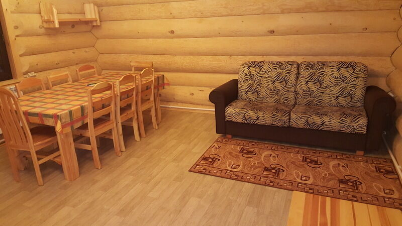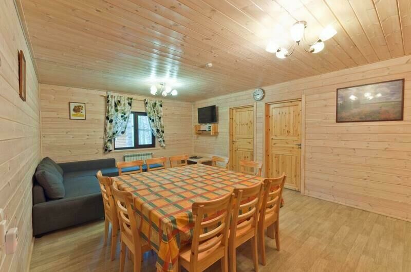 Большой одноэтажный коттедж с гостиной-столовой и 3-мя отдельными спальными комнатами. Из прихожей вы сразу попадаете в гостиную с кухонной частью, где имеется раковина с холодной и горячей водой, холодильник, микроволновка, мультиварка, электрочайник, наборы посуды и столовых приборов, рассчитанные на всех гостей. Здесь же стоит обеденный стол и двуспальный диван, на стене висит телевизор, подключенный к кабельному. Туалетная комната с холодной и горячей водой, оборудована душевой кабиной, унитазом, раковиной, над которой зеркало. Одна спальная с двуспальной кроватью. В двух других по две полутороспальных. Гостям предоставляются постельное белье, тапочки, полотенца, фен, туалетные принадлежности. Во всех помещениях функционирует центральное отопление и доступен бесплатный интернет Wi-Fi.
