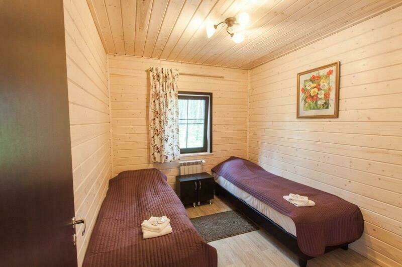 Двухэтажный коттедж с гостиной-столовой и 4-мя спальными комнатами. На первом этаже просторная гостиная с тремя зонами. Первая отведена под кухню – там вы найдете большой холодильник, микроволновую печь, мультиварку, чайник, раковину, столовые приборы и посуду. Вторая зона является обеденной – там стоит стол и на стене висит телевизор, который подключен к спутниковой антенне. Третья зона предназначена для отдыха – там стоит большой угловой диван, который раскладывается на 2 спальных места. В туалетной комнате стандартный набор: душевая кабина, раковина с зеркалом, унитаз. Наборы тапочек, полотенец, туалетных принадлежностей, фен. На втором этаже четыре спальни. В половине из них установлены двуспальные кровати. В остальных – по две полутороспальные. Во всех помещениях центральное отопление и бесплатный интернет Wi-Fi. На кухне и в туалете горячая и холодная вода.