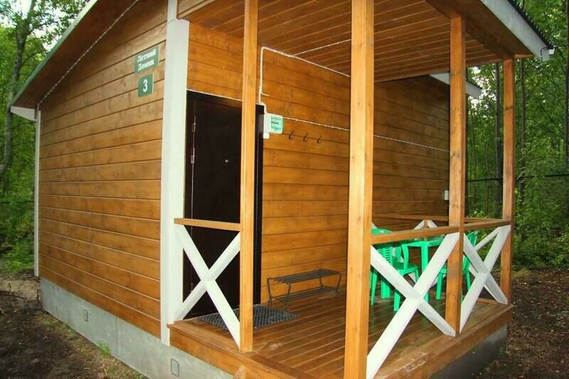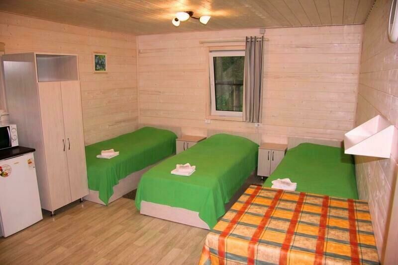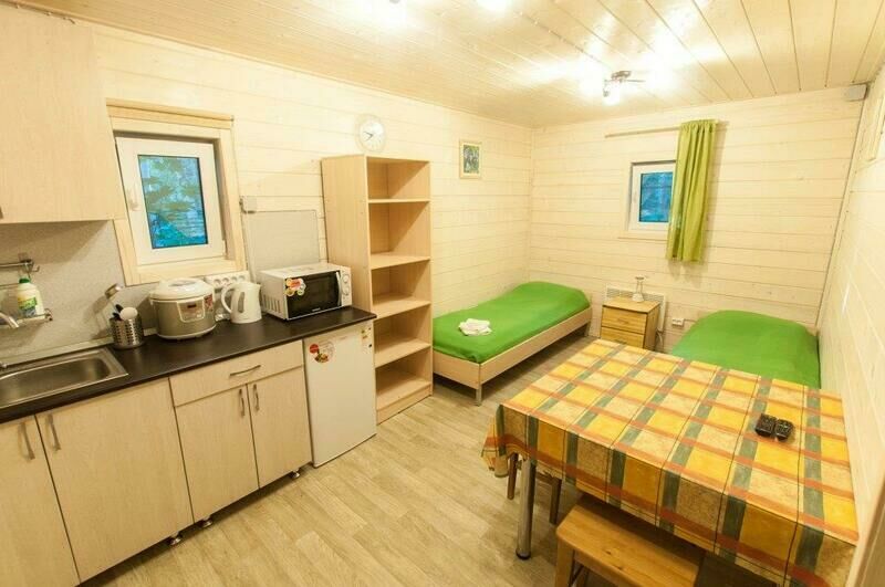 Каждый домик одноэтажный, имеются небольшие открытые веранды со столиком и стульями. Зайдя в домик Вы сразу попадаете в небольшую уютную гостиную-студию совмещенную с кухонным уголком, оборудованным холодильником, микроволновой печью, мультиваркой, необходимой посудой, раковиной с холодной и горячей водой, электрочайником и помпой с родниковой водой. В гостиной находятся 2-е полутораспальные кровати, обеденный стол и табуреты для двоих. Каждый домик оборудован отдельным санузлом с душем с горячей и холодной водой, раковиной и унитазом, а также всеми необходимыми принадлежностями-шампуни, мыло, полотенца, тапочки, туалетной бумагой. Рядом с каждым домиком расположена зона отдыха с мангалом, деревянным столом и 2-мя скамейками.