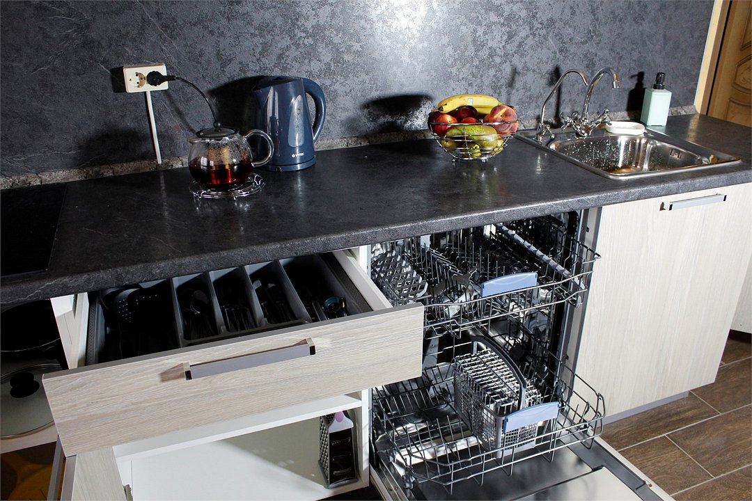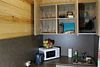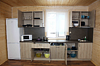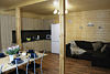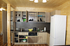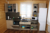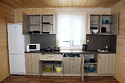 В кухне предусмотрены холодильник, микроволновая печь, варочная поверхность, посудомоечная машина, электрический чайник и посуда. В зоне отдыха — стол, угловой диван, телевизор и камин.