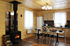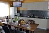 Кухня оборудована холодильником, микроволновой печью, варочной поверхностью, посудомоечной машиной, электрическим чайником и посудой. В обеденной зоне предусмотрены вместительный стол, большой диван, телевизор и камин.
