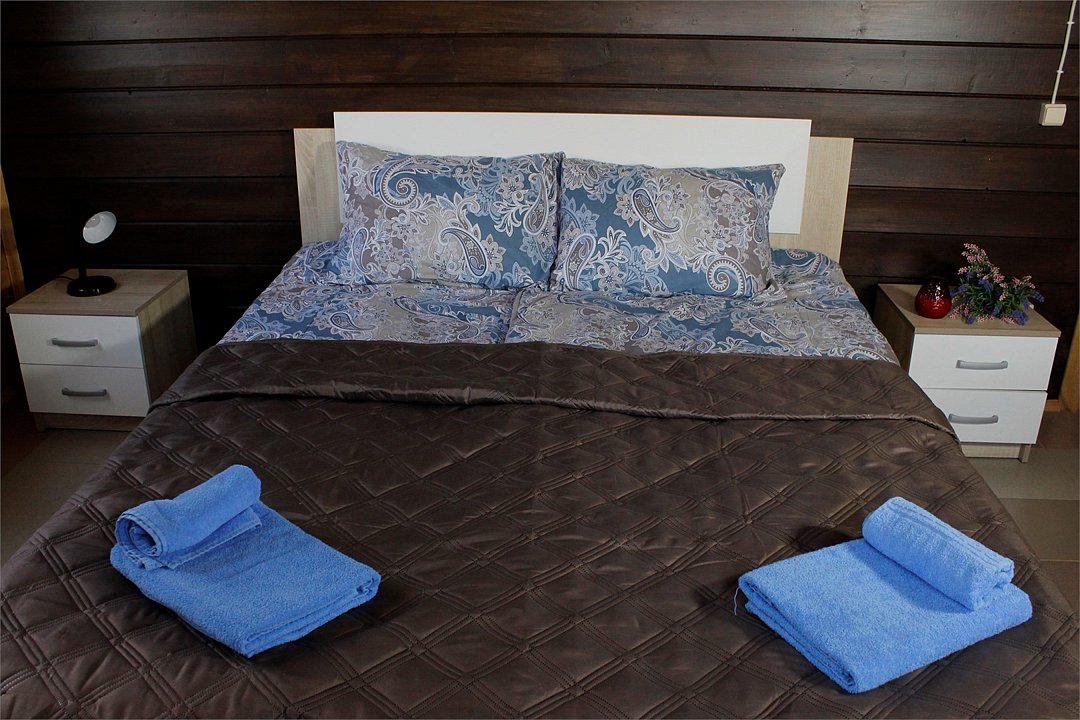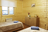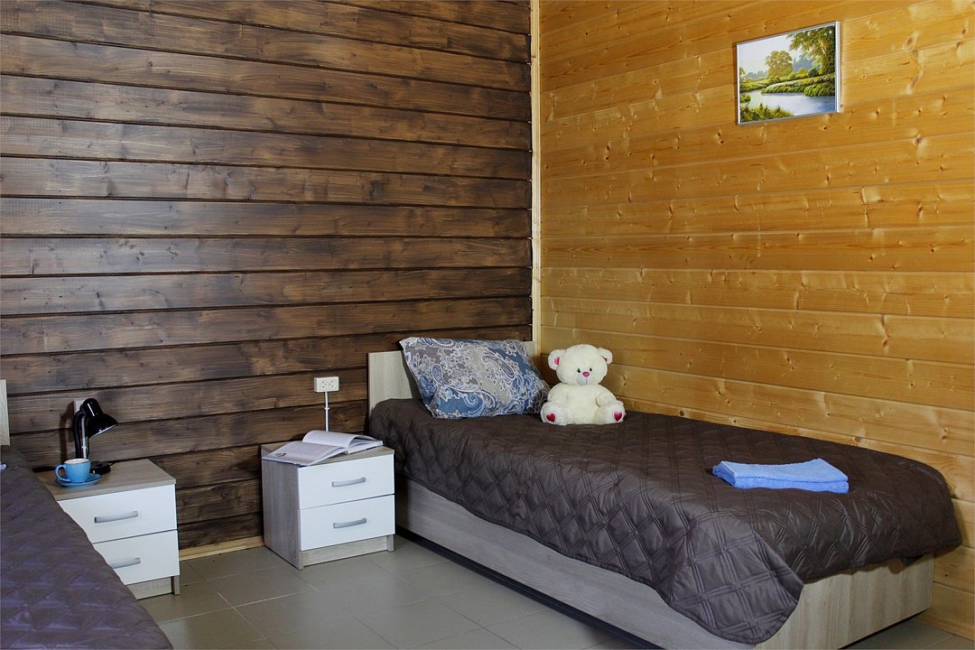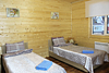 Двухэтажные деревянные коттеджи с тремя спальнями, в каждой из которых расположены по две односпальные кровати, которые при желании трансформируются в одну двуспальную, а также прикроватные тумбы и комод.
