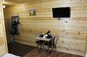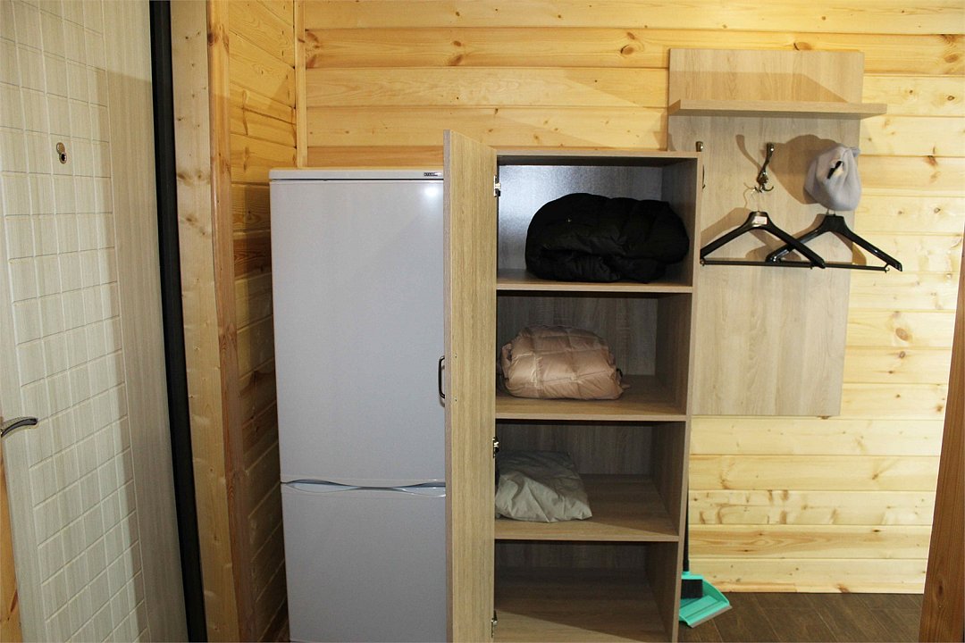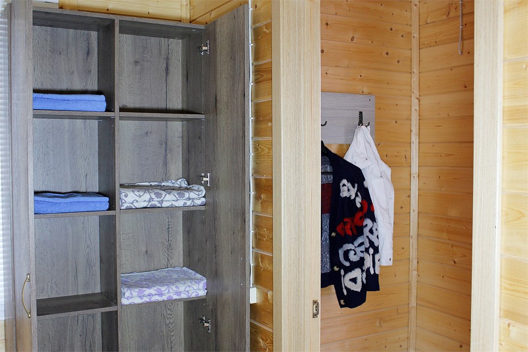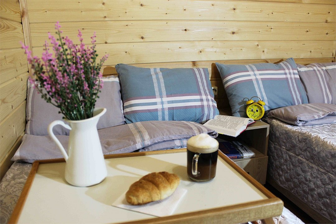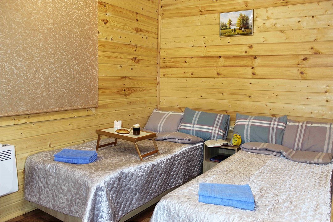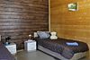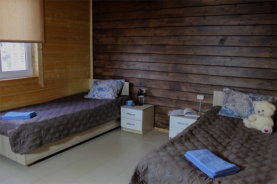 Деревянные домики с двумя спальнями, в каждой из которых расположены две односпальные кровати, которые при желании трансформируются в одну двуспальную, а также прикроватные тумбы и комод.