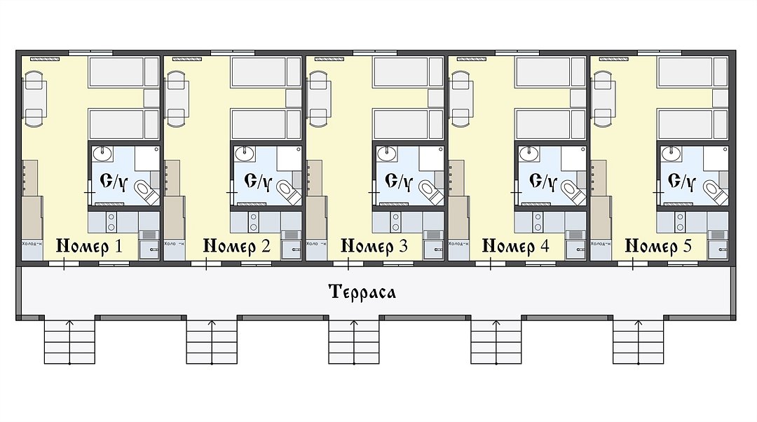 Двухэтажные большие дома с двумя санузлами и пятью спальнями, в каждой из которых расположены по две односпальные кровати, которые при желании трансформируются в одну двуспальную, а также прикроватные тумбы и комод.