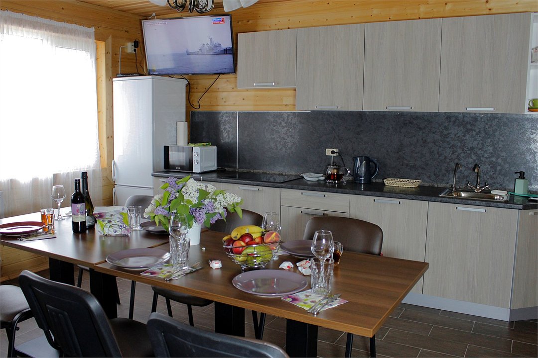 Кухня оборудована холодильником, микроволновой печью, варочной поверхностью, посудомоечной машиной, электрическим чайником и посудой. В обеденной зоне предусмотрены стол, угловой диван, телевизор и камин.
