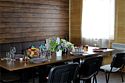 Кухня оборудована холодильником, микроволновой печью, варочной поверхностью, посудомоечной машиной, электрическим чайником, посудой. В обеденной зоне предусмотрены стол, угловой диван, кресла, телевизор, камин.