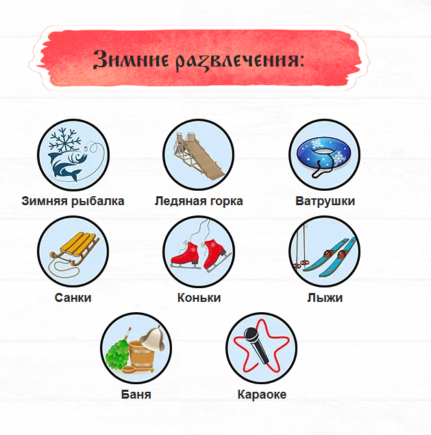 Для маленьких гостей работают детские площадки, качели и народные развлечения на свежем воздухе. Здесь есть спортивный инвентарь и надувные игрушки для плавания. Зимой доступны ватрушки, санки, лыжи и коньки. У администратора можно взять караоке и настольные игры для всех возрастов.