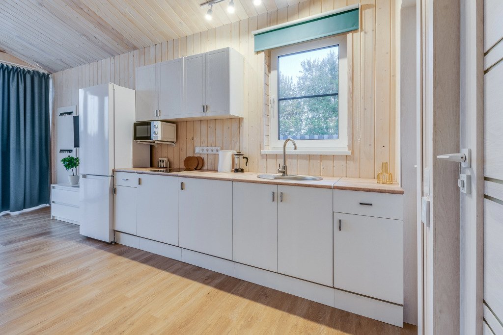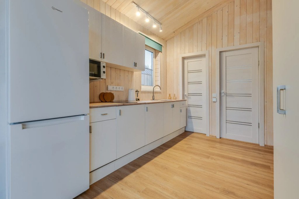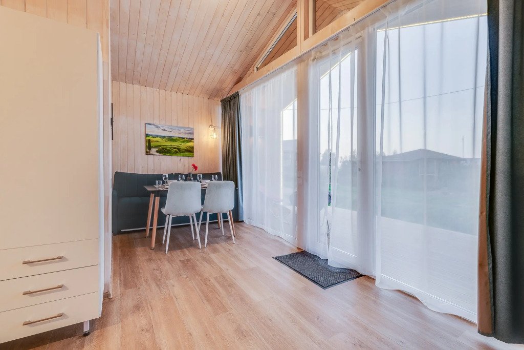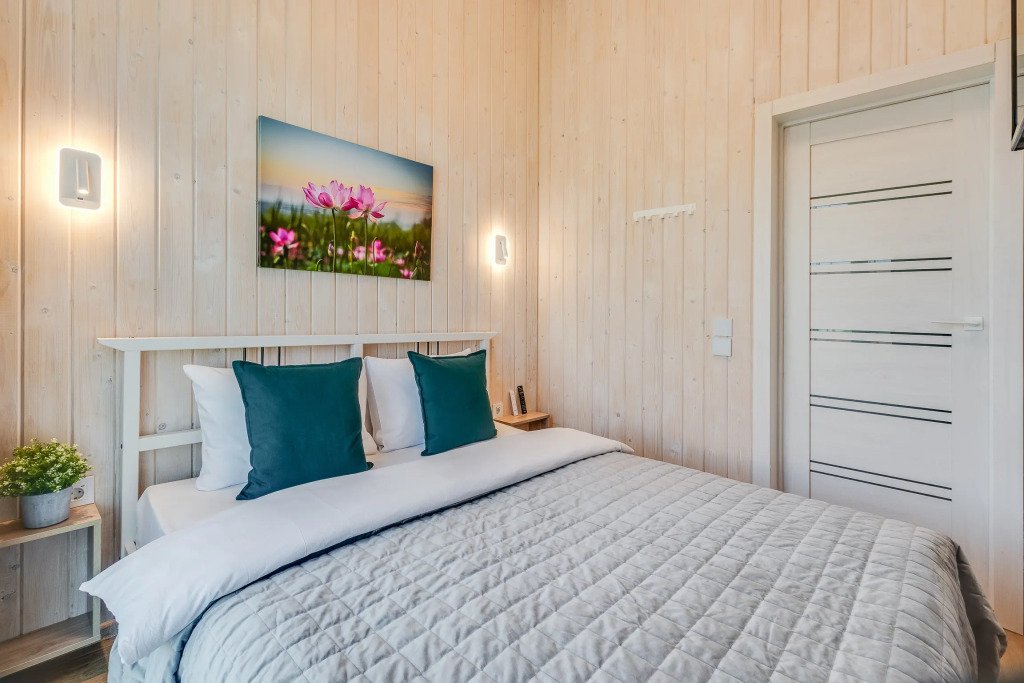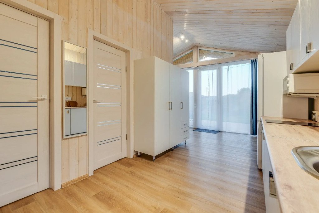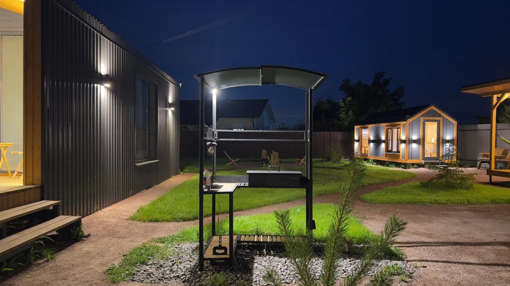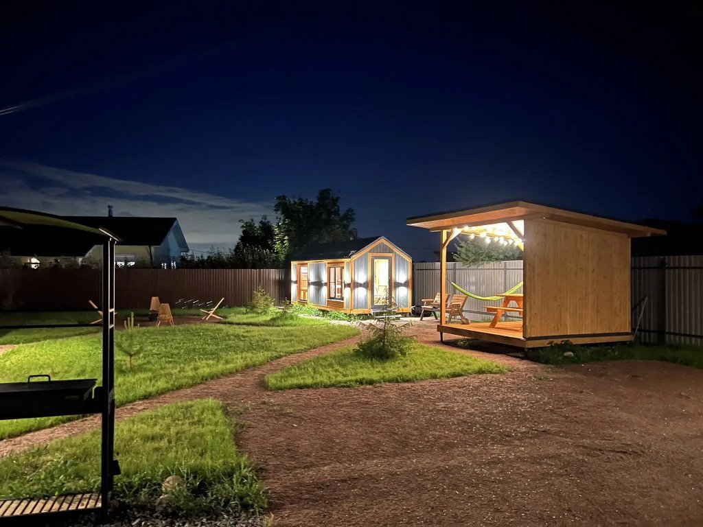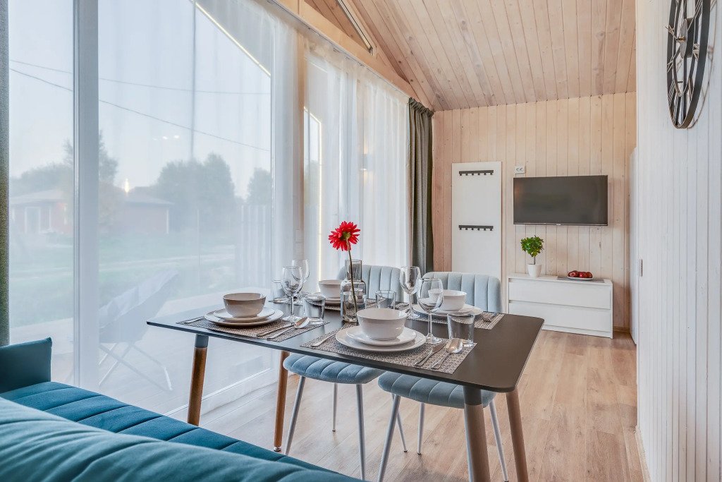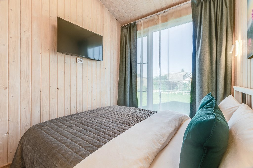 Дом новый, площадью 50 кв. м, расположен недалеко от города, выполнен в современном стиле с панорамным остеклением. В доме могут разместиться до 6 человек, есть гостиная и две изолированные спальни. В спальнях и гостиной установлены двуспальные кровати с ортопедическими матрасами. В доме три телевизора — со Smart TV в каждой спальне и в гостиной. Интернет в доме проводной, сигнал стабильный.