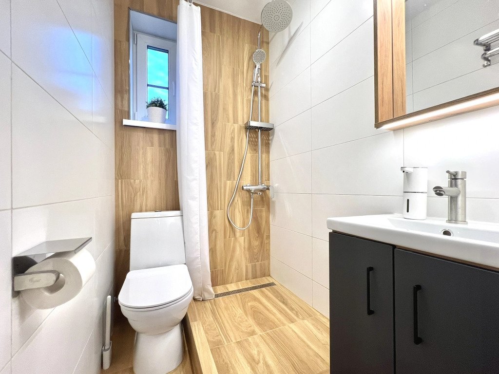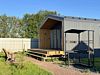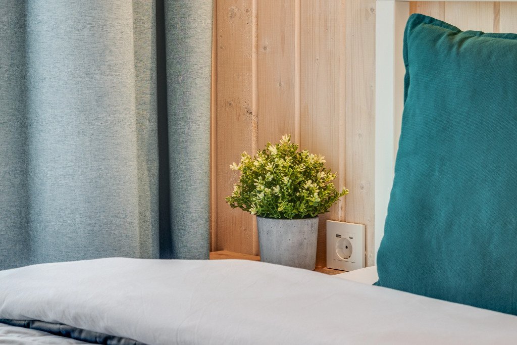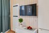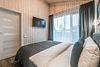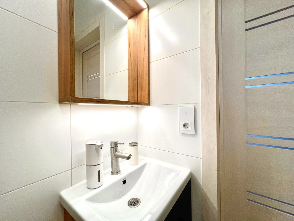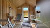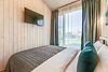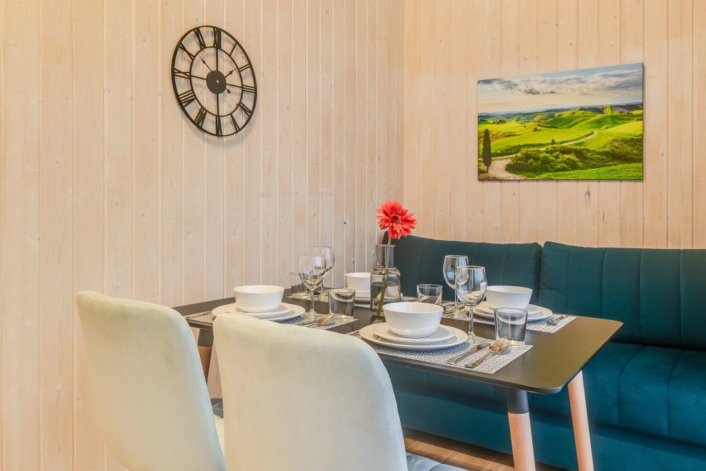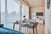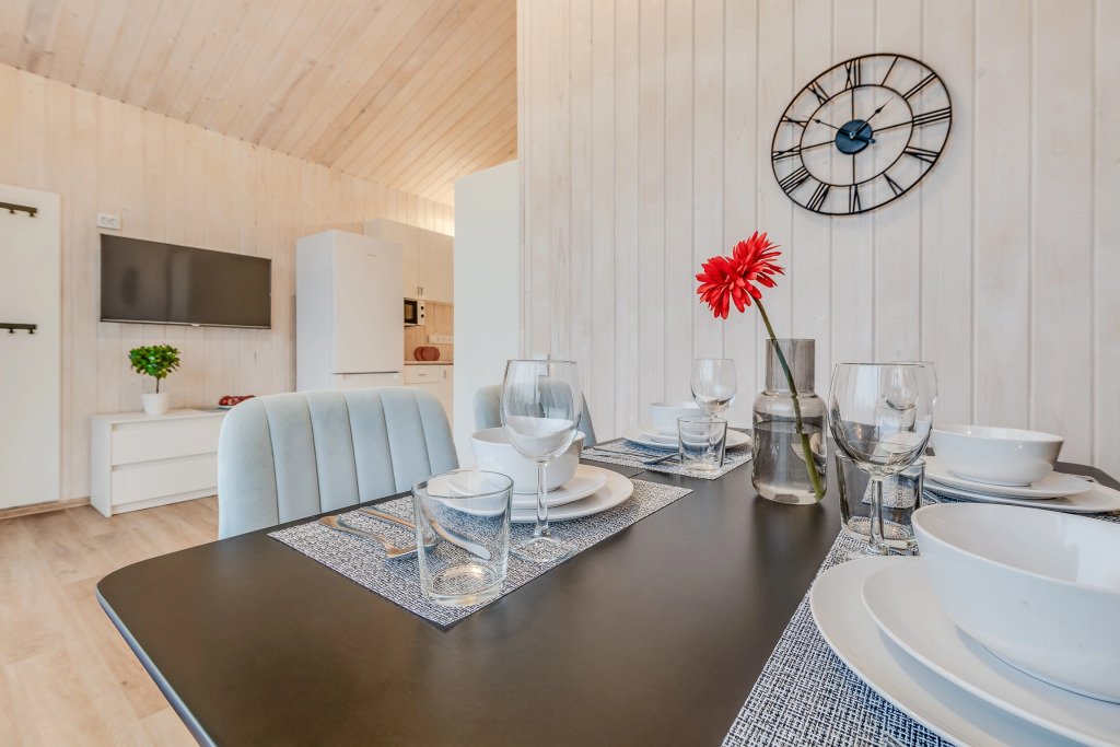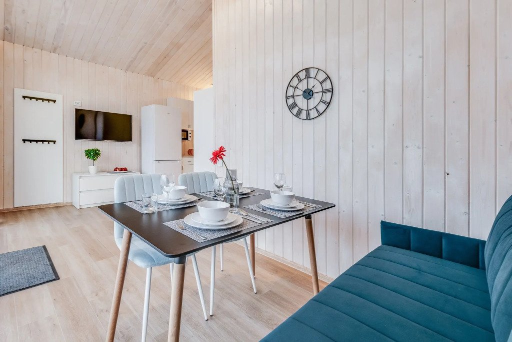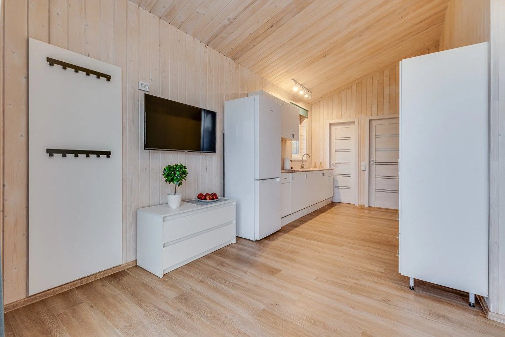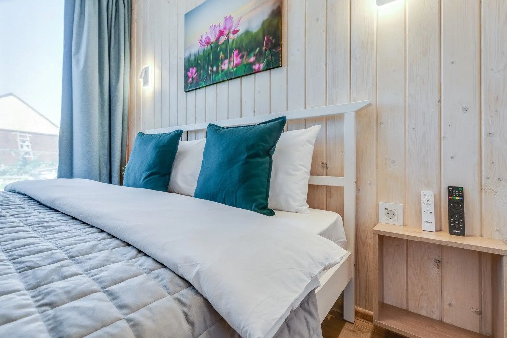 Дом новый, площадью 50 кв. м, расположен недалеко от города, выполнен в современном стиле с панорамным остеклением. В доме могут разместиться до 6 человек, есть гостиная и две изолированные спальни. В спальнях и гостиной установлены двуспальные кровати с ортопедическими матрасами. В доме три телевизора — со Smart TV в каждой спальне и в гостиной. Интернет в доме проводной, сигнал стабильный.